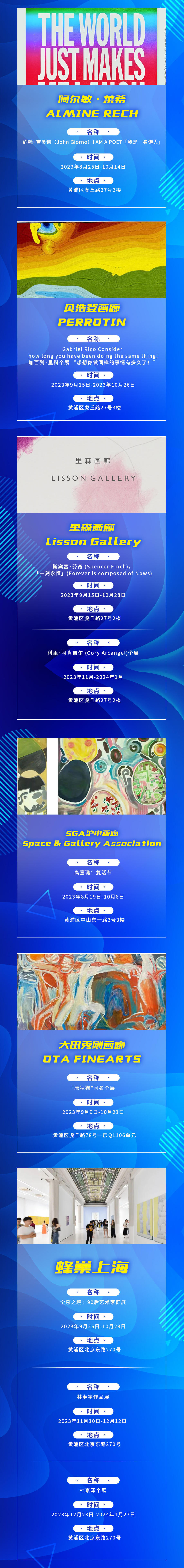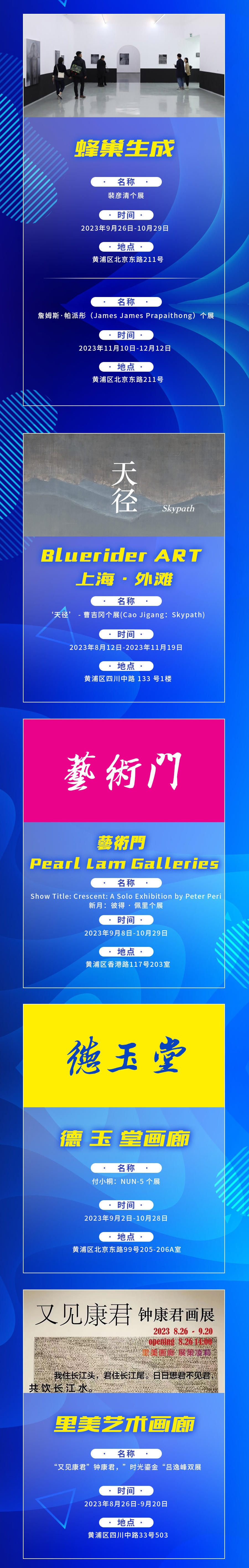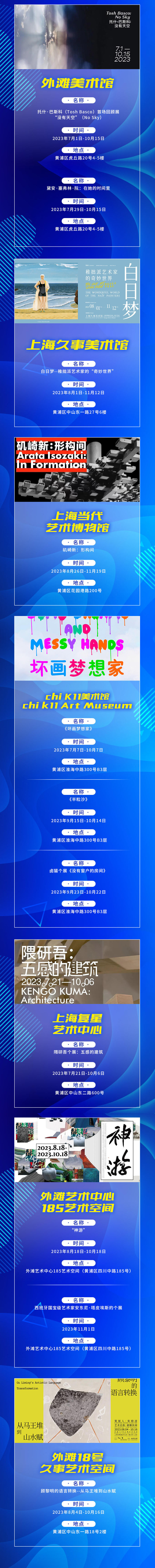 9月至11月期间,建筑艺术、潮流艺术、数字艺术、时尚艺术及设计策展相关主题的近10场系列活动将陆续亮相,带来绘画、雕塑、摄影、装置、设计等多样化的艺术形态。区域内32大场馆,58场展览,聚焦城市空间,将艺术融入生活,塑造与生活共融、有活力、有层次的艺术街区。