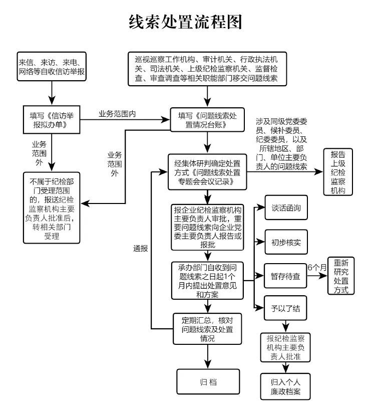 1.问题线索处置不得拖延和积压,处置意见应当在收到问题线索之日起1个月内提出,并制定处置方案,履行审批手续(1个月时限自收到问题线索之日算起,到报送至企业纪检监察机构主要负责人审批之日止)。