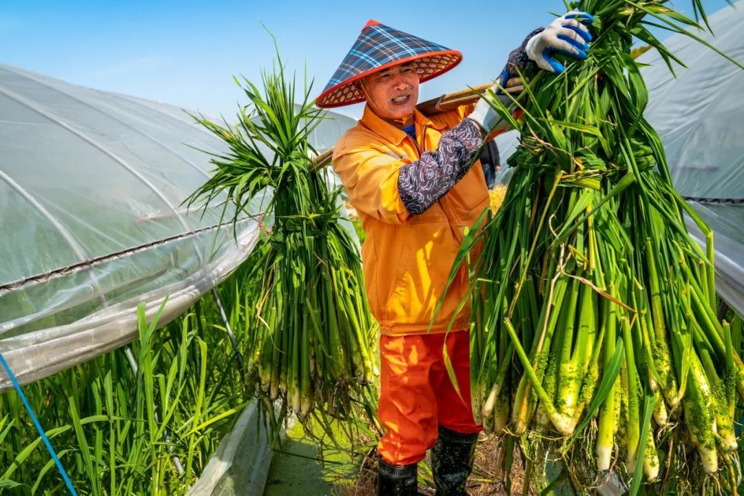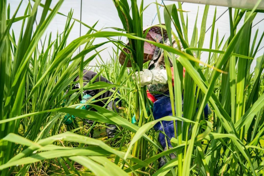 每年5月,青浦练塘的头茬露天“练塘茭白”进入成熟季。大大小小的种植基地内,郁郁葱葱的茭叶覆盖了大片农田,微风吹拂,茭叶“沙沙”作响,茭农们头戴草帽、身着防水服和雨靴,在及膝高的水塘里,熟练地挑选采收成熟的茭白。紧挨着农田的粗加工点内,工人将采收上来的一捆捆茭白熟练地整理、去壳、切根后装袋,等待茭白批发商前来收购。