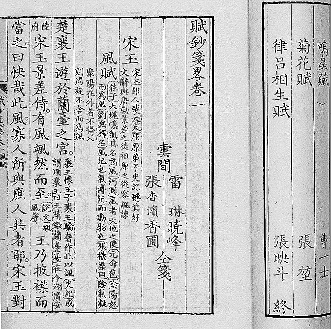 《赋钞笺略》为张杏滨与同窗雷琳合著。此书收录周秦至清初赋90家126篇,多选言志小赋,唐赋27家最多,清赋24家次之,一变详古略今习气,笺释内容丰富详密。张、雷两人皆为沈德潜(清代著名诗人,曾任内阁学士兼礼部侍郎)及门弟子,故沈氏在序中称此书根据确当而辞尚体要,“盖自五臣选赋注后,庶几嗣音矣。”