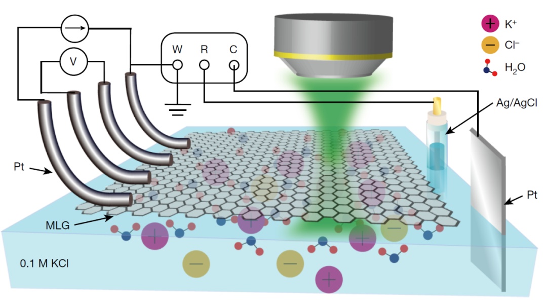 石墨烯-电解质界面。课题组将单层石墨烯(MLG)悬浮在由0.1M氯化钾(KCl)溶液组成的电解质表面。该溶液含有钾离子、氯离子和水分子。四根铂导线连接到石墨烯上,用于四电极的电学表征和门电位调控。石墨烯作为工作电极(W),银/银氯化物(Ag/AgCl)作为参比电极(R),铂为对电极(C)。非线性光谱学分析方法探测悬浮石墨烯-电解质界面的微观结构。