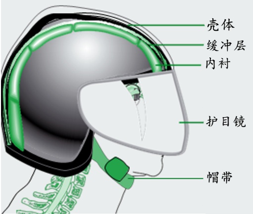 壳体:这是头盔最结实的部分,通过大面积的释放冲击能量来保护头部。坚硬的外壳在受到外界硬物冲击时仍具有一定的压缩功能,从而缓冲动能,减轻伤害。同时它能对外界细小的锐器和高速碰撞物提供保护,因此头盔的外壳必须坚硬,同时外表面应光滑。