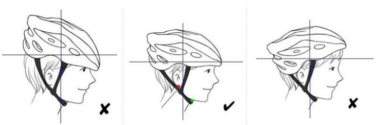 正确佩戴头盔应该是头盔调节带的交叉在耳下(上图中红点)一指厚度的位置,大约1.5厘米。整个带子在下颚(上图中绿点)而不是喉部,下巴的扣带松紧度以可以容下一只手指为标准,大约1.5厘米。