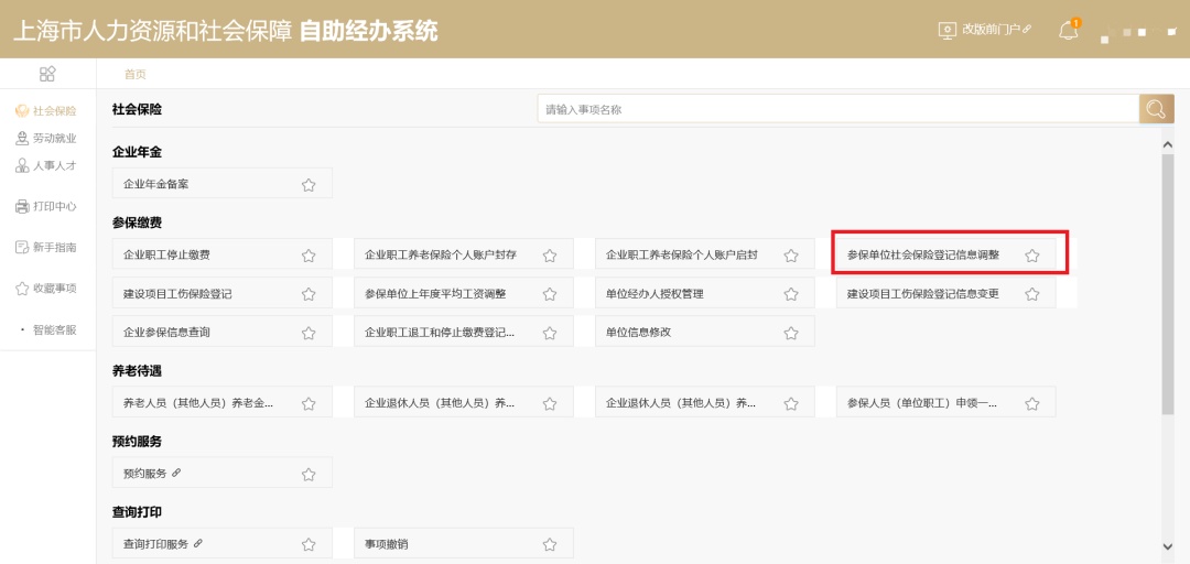 点击“社会保险-参保缴费-参保单位社会保险登记信息调整”。