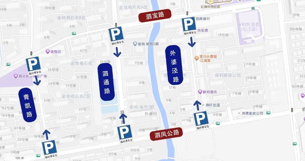 市民可在外婆泾路(泗凤公路-泗宝路)、泗通路(泗凤公路-泗宝路)、青凯路(泗凤公路-泗宝路)靠东单侧停车。