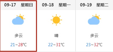 根据市气象局预测,9月17日天气预计以多云为主,最低气温21℃,最高气温28℃。