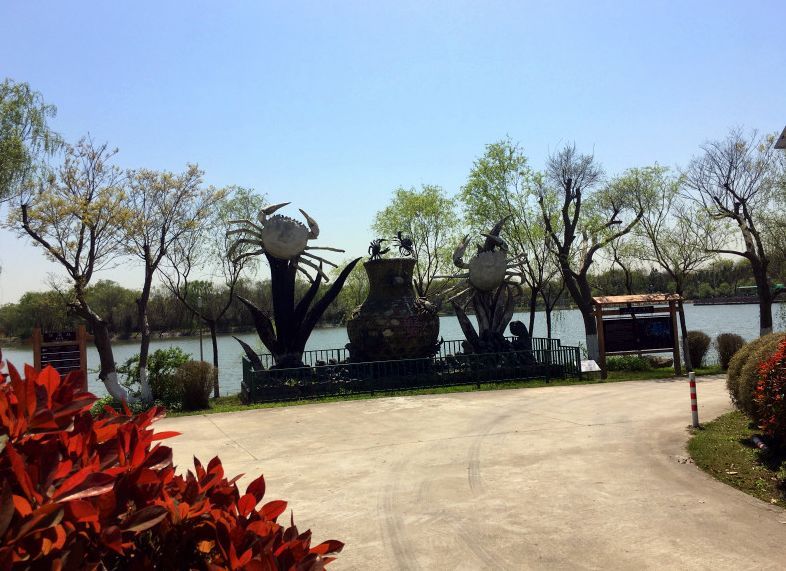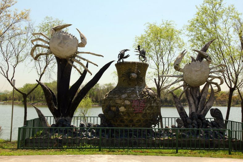 崇明蟹王雕像毅力高湖西端,正对高家竹韵及紫藤长廊,每年吃蟹季节都在此有表演