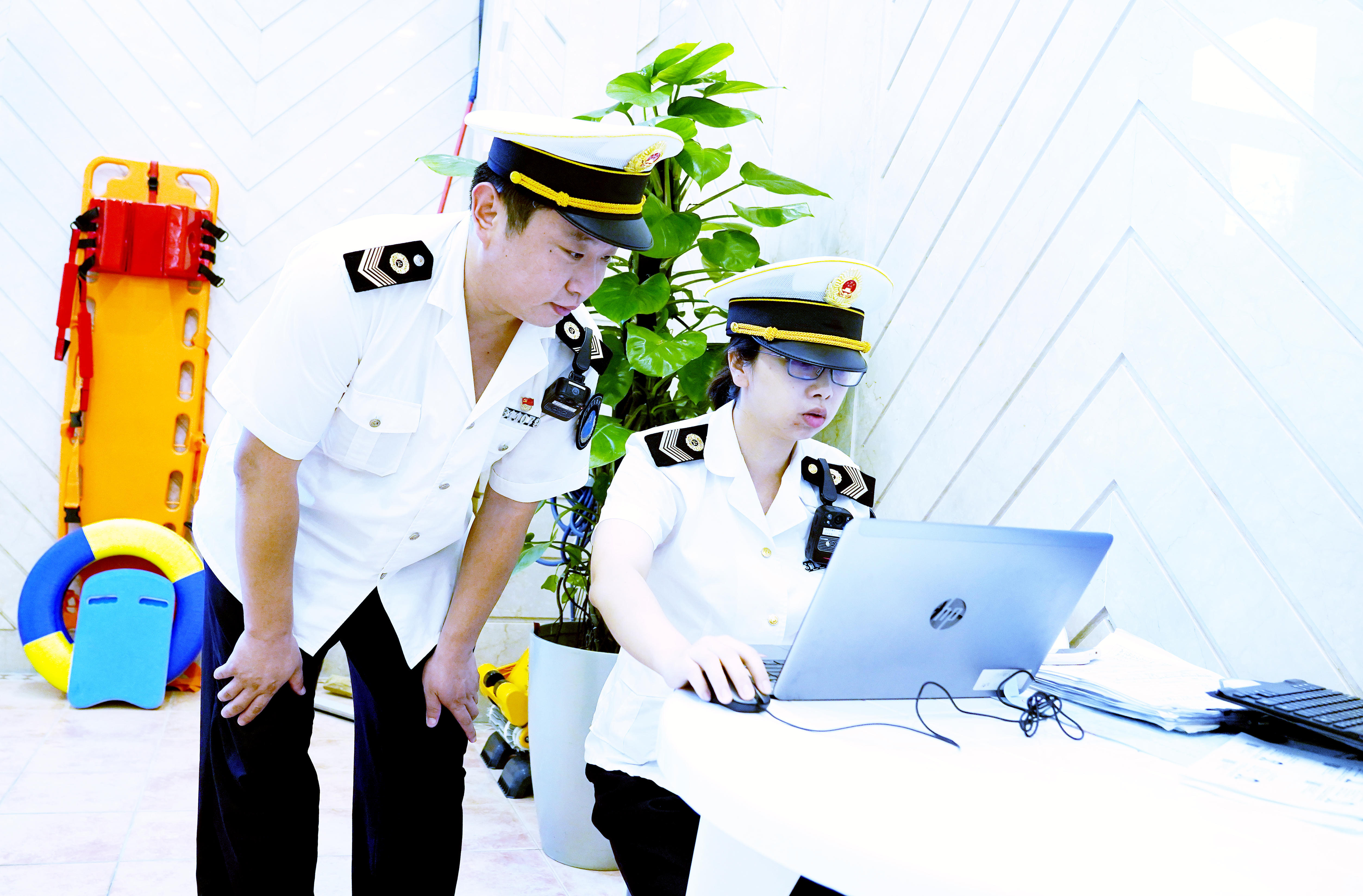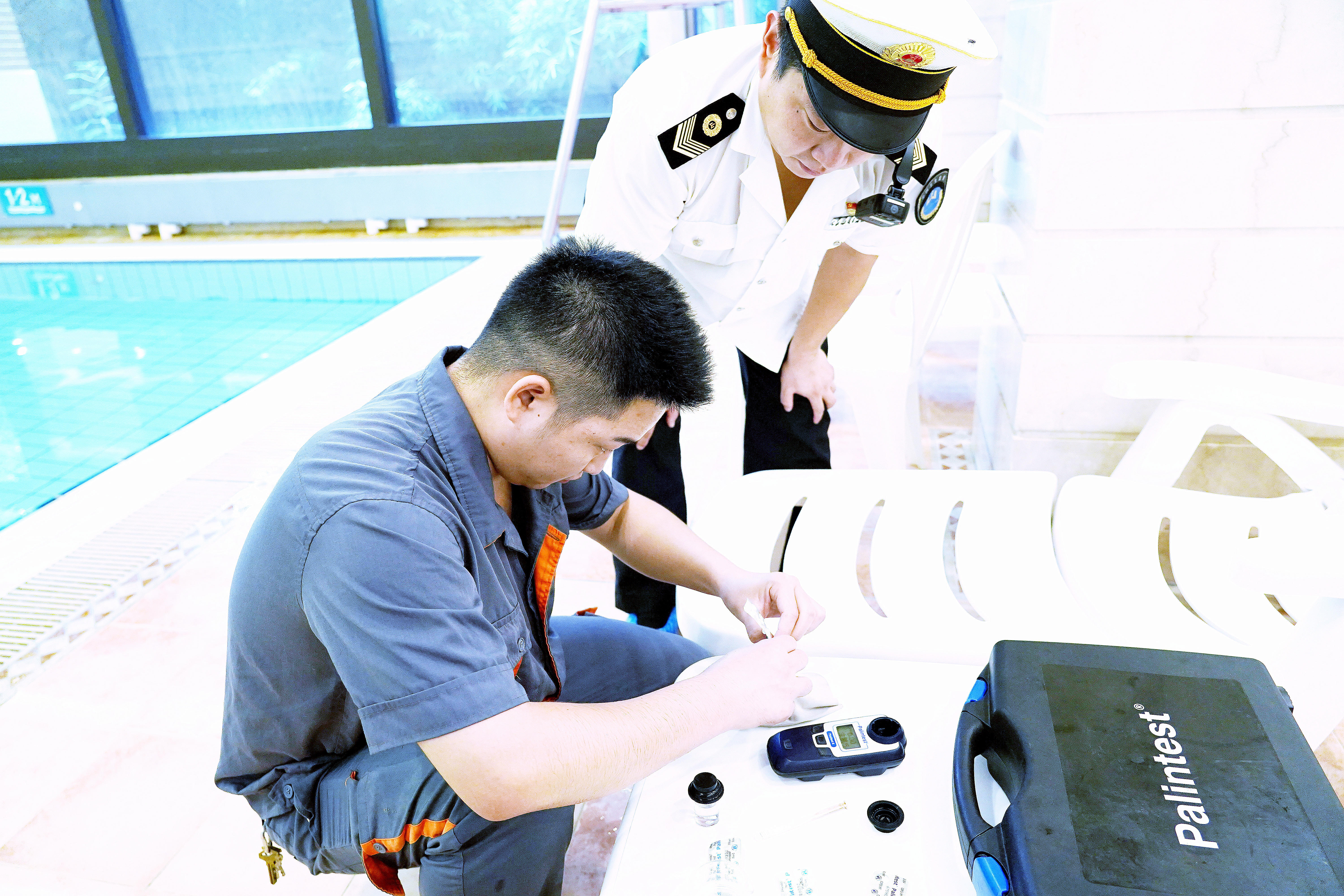 青年队员们有条不紊、配合默契地分头完成调查、快检工作。结合调查中发现的问题,监督员进一步调取监控,现场问询泳池工作人员,提出后续处置意见。