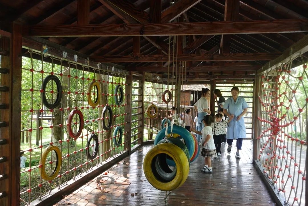 廊下幼儿园老师翁雁翎说:“幼儿园地方比较大,我们在这个区域里面打造了一个原生态的平衡的区域,小朋友们可以在这个地方走动,锻炼他们的肢体协调能力。还有山洞等,都是比较纯天然的一个活动区域。还有一个水循环和净化系统,可以在这个地方进行一些净水的科学实验,增加一些科学方面的知识。”