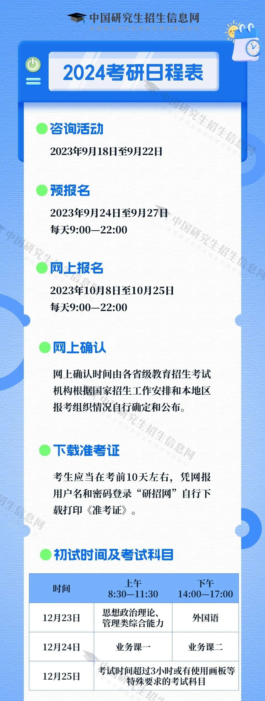中国研究生招生信息网介绍,2024年全国硕士研究生招生考试初试定于2023年12月23日至24日,考试时间超过3小时或有使用画板等特殊要求的少数考试科目安排在12月25日。网上报名工作安排在2023年10月8日至10月25日(每天9:00~22:00),预报名工作安排在9月24日至9月27日(每天9:00~22:00)。详见↓
