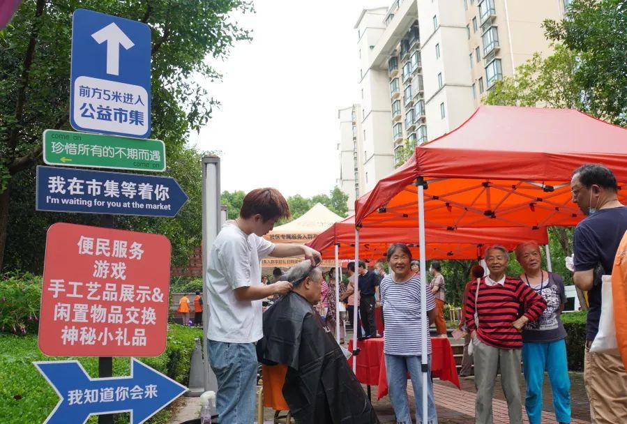 整个活动中,不乏身穿橙色马甲志愿者们的身影,他们有的维护秩序,有的分发道具,还有的当裁判打分,热情地接待着每一位前来体验的居民。王师傅是理发项目的服务志愿者,从2019年起就担任该项目的志愿者,热情周到的服务态度,让前来参加活动的群众赞不绝口,集市上充满了欢声笑语。在理发摊位,志愿者王师傅把提前准备好的号码按照顺序发给居民。针对残疾、高龄长者等行动不便的特殊群体,王师傅优先安排,不用排队即可理发。现场秩序井然,气氛融洽,居民纷纷为志愿者点赞。