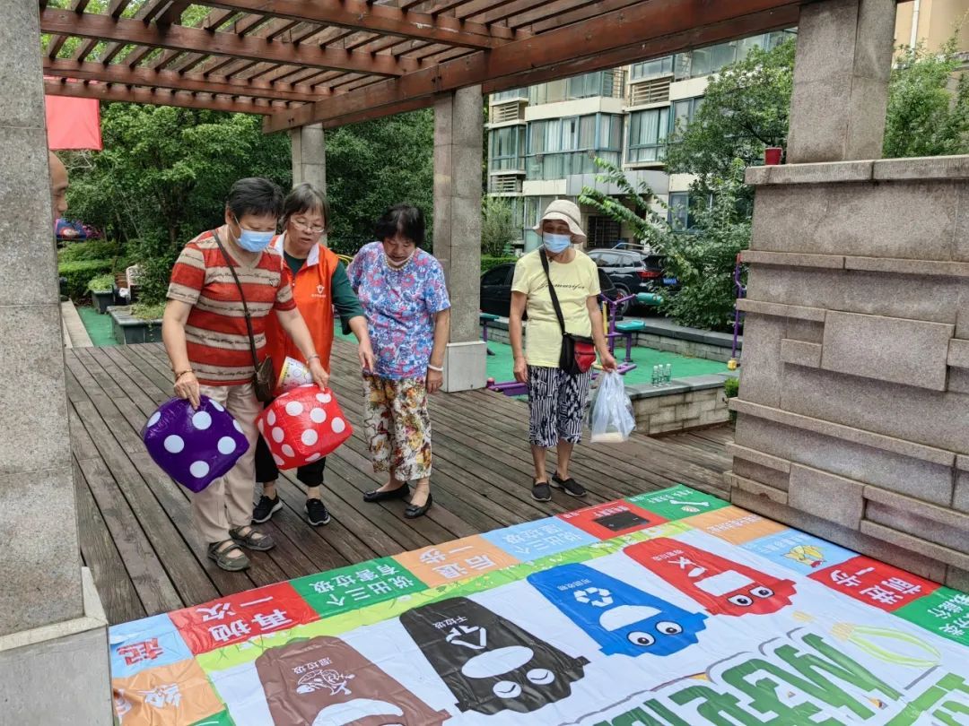 除了老百姓喜欢的便民服务,集市的另一头也相当热闹。无论是投壶游戏,还是根据emoji表情猜成语、用飞行棋玩垃圾分类,都很受欢迎,前来打卡的居民络绎不绝。一边转动飞行棋,一边学习垃圾分类知识;一边看着可爱的emoji图一边猜成语,居民们脸上洋溢着灿烂的笑容。