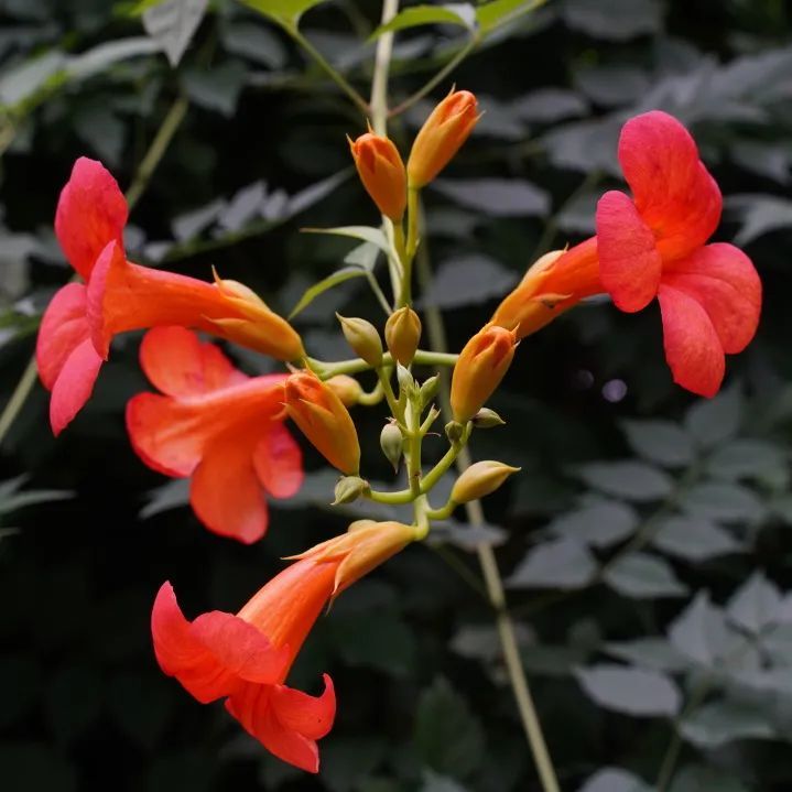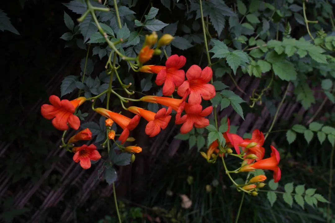 只见凌霄枝干虬曲,翠叶如盖,橙红色的花儿一朵挨一朵,有的在叶间绽放,更多的则在枝藤上开成一连串。满眼绿意中透出星星点点,像一支支小喇叭,正吹奏着一曲曲清秋的乐章。