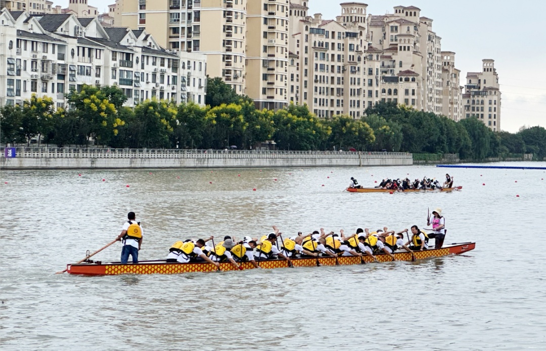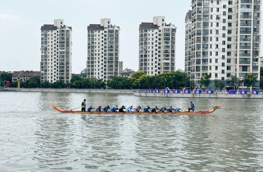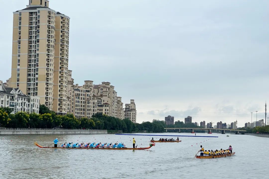 天色不佳,但正在做赛前最后准备的选手依然热情高涨,他们身着队服坐上龙舟,跟随鼓点节奏奋力挥臂划桨,动作整齐划一。记者了解到,此次全国各地的24支队伍,全部参加了22人大龙舟项目,选手们将就200米和500米直道赛展开比拼。“第一次到泗泾古镇,感觉在这儿比赛别有一番滋味。现在准备去试试水了,水道看起来很宽,比我们之前训练的场地条件更好。”来自上海国际友人龙舟队的选手Yolanda告诉记者。