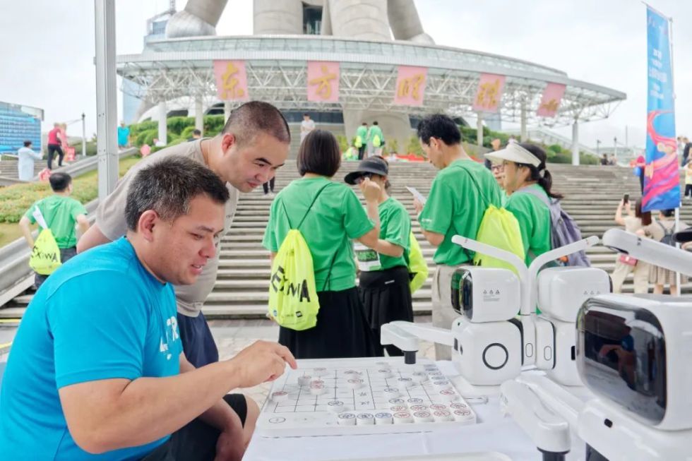 上海城市定向户外挑战赛激战正酣的同时,上海杯象棋大师公开赛则在户外广场上带来了“元萝卜”AI下棋机器人展示。机器人伸展灵活的机械臂,执子与市民对弈,展现科技与传统棋艺运动的魅力,同时也为旅游体验加分。下午,象棋大师公开赛正式开赛,尽管因为下雨,赛场移至室内,但是魅力丝毫不减,令观者大呼过瘾。