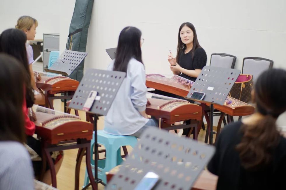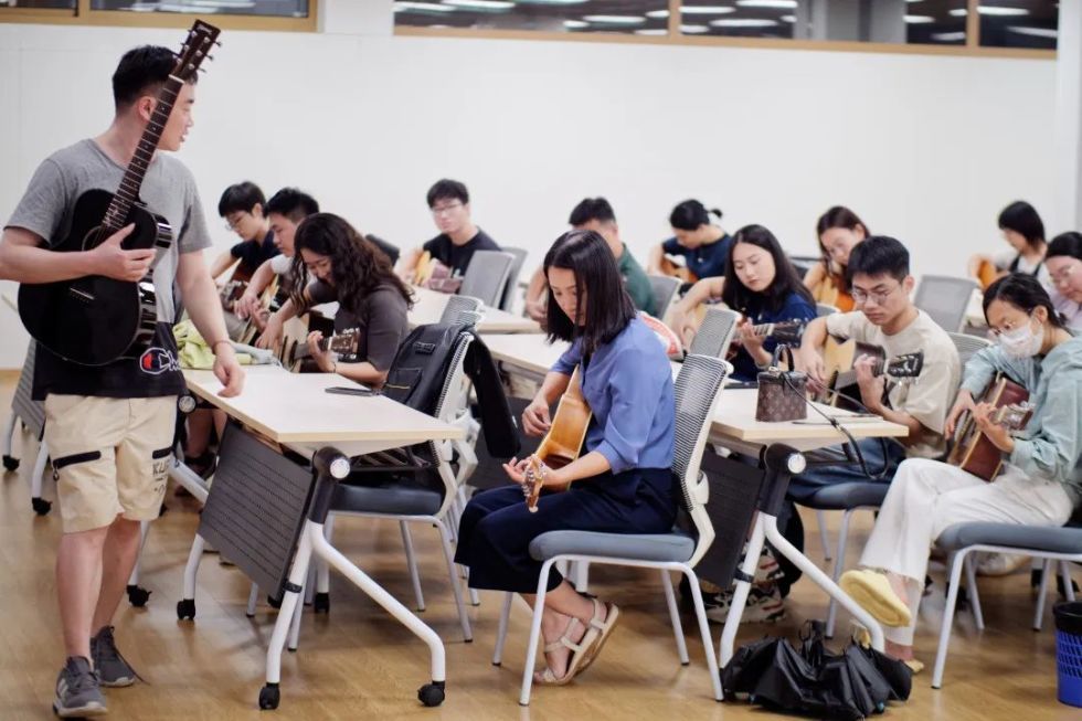 晚上7点整,古筝课由上海音乐学院古筝演奏专业硕士研究生赵晨爽授课。根据“夜校”要求,她将依照教案,通过12节课指导学员弹奏《春江花月夜》《声声慢》等一些基础、流行的曲目,达到一个比较流畅、悦耳的效果,将一批零基础市民引入古筝艺术之门。而在浦东群艺馆的另一间教室里,资深吉他、尤克里里教学老师,同样毕业于上海音乐学院的顾叶俊正在授课。顾叶俊是一名开朗的男青年,他在严谨的教学中时而插入笑话,时而即兴弹奏一曲,让学员们乐不可支。课后,部分学员还拖着老师不放,让老师一对一讲解吉他指法,一个半小时的课程生生“拖堂”到了近两个小时。
