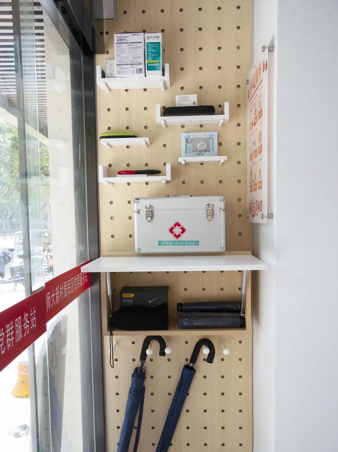 光有“颜值”肯定是不够的,有内涵、有温度,才能真正成为温暖的“港湾”。为进一步打通社区服务的“最后一公里”,师大新村的沿街党群服务站内设置了便民服务区域,配备雨伞、家用工具箱、急救箱、手提灯、驱蚊液等便民物品,供有需要的居民免费使用,针对居民区老年人居多的特点,还特地配备了血糖仪、血压仪等。