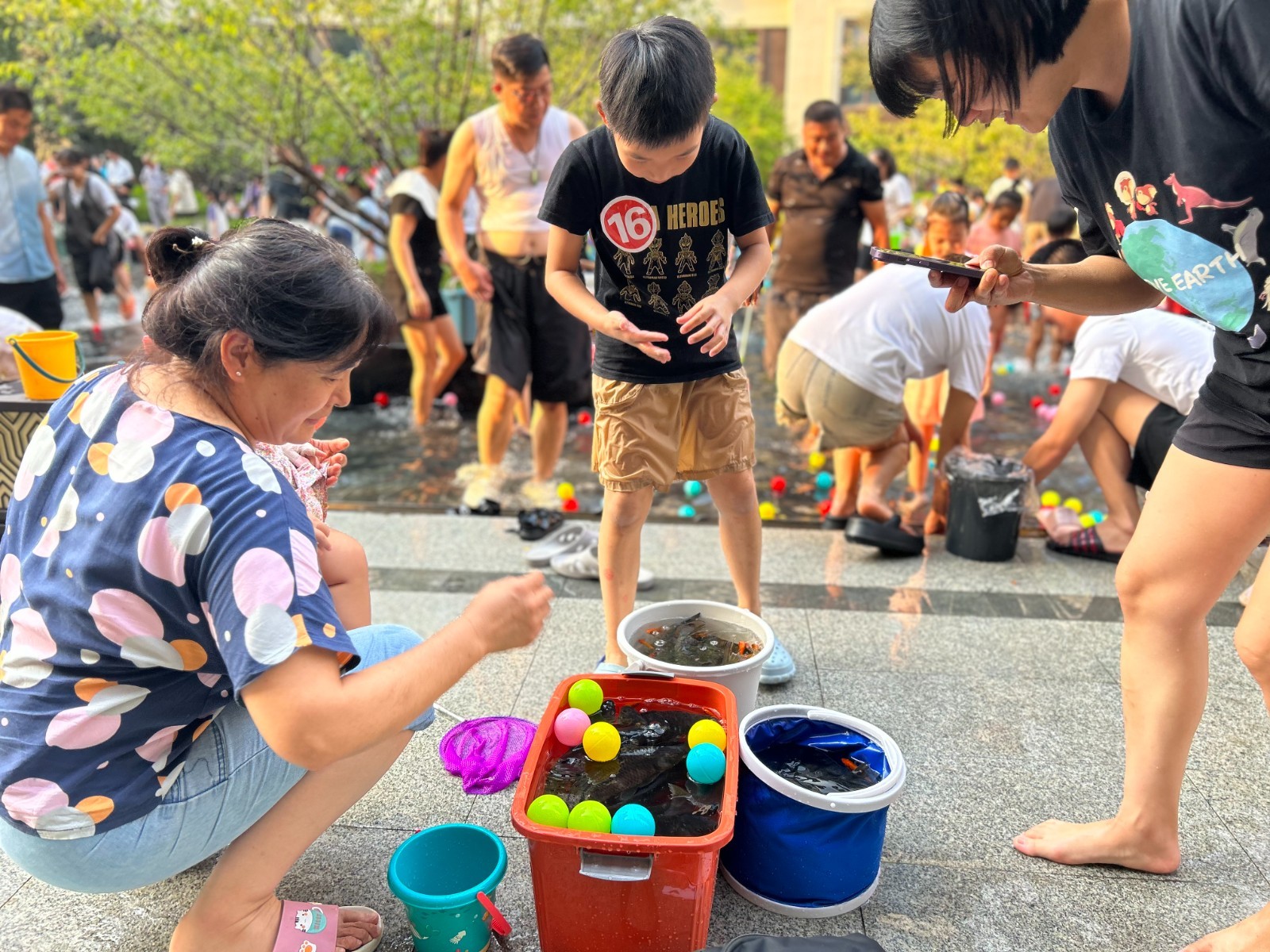 活动现场,家长和孩子们各展身手,有的大力猛扑,激起层层水波;有的目不转睛,静静等待时机,各有各的方法,和鱼儿你追我赶。大家互相比拼,看谁抓的鱼儿最多。几番下来,只见抓鱼者神情雀跃,观战者跃跃欲试,欢声笑语如水波般荡漾在尚同社区。最后,志愿者和工作人员向每一位参与活动的小朋友颁发奖牌以示鼓励,大朋友和小朋友们都欢欢喜喜、满载而归。在社区里,糖画、面人、桃木雕等非遗文化助阵,向小朋友们展示制作过程,让他们感受非遗文化的魅力,真正做到寓教于乐,寓学于趣。