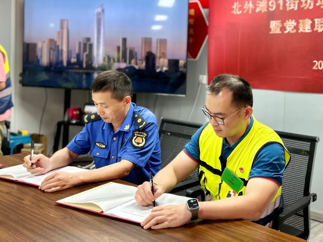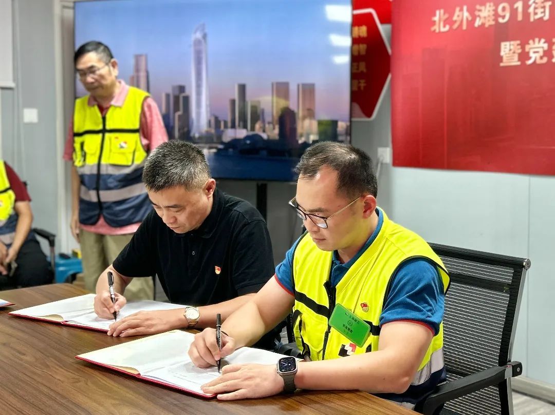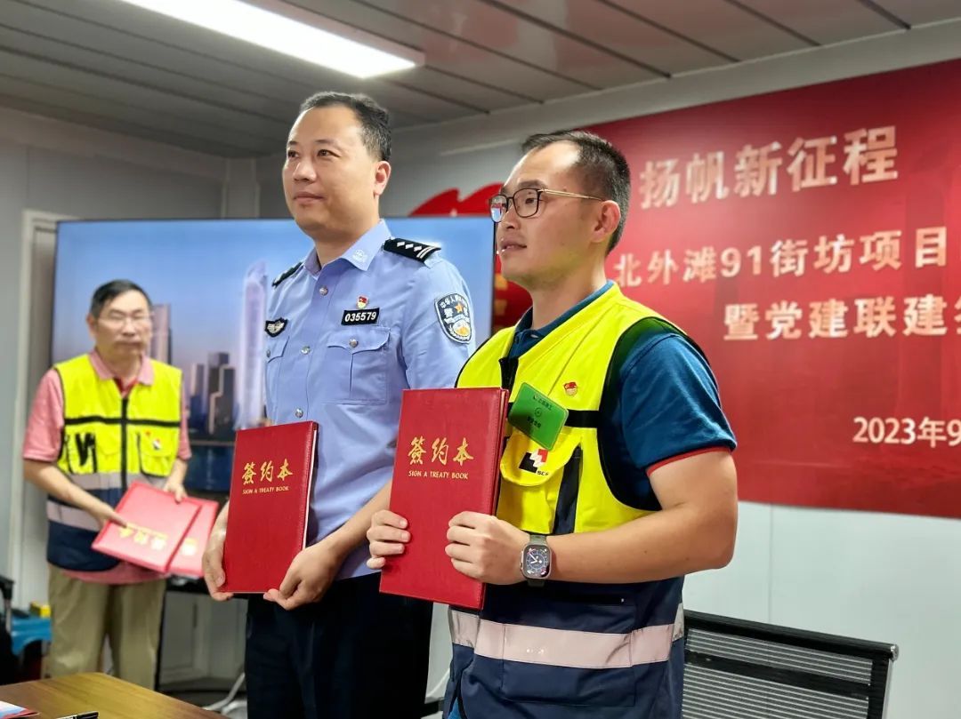仪式上,项目临时党支部与区建管中心、滨江治安派出所、北外滩城管中队及项目周边居委会签订了《党建联建协议书》,凝聚各方力量,全力推动项目尽快出形象、出亮点;同时,不断改进和优化项目建设过程中的各项管理工作,营造文明、安全、和谐的开发建设氛围。