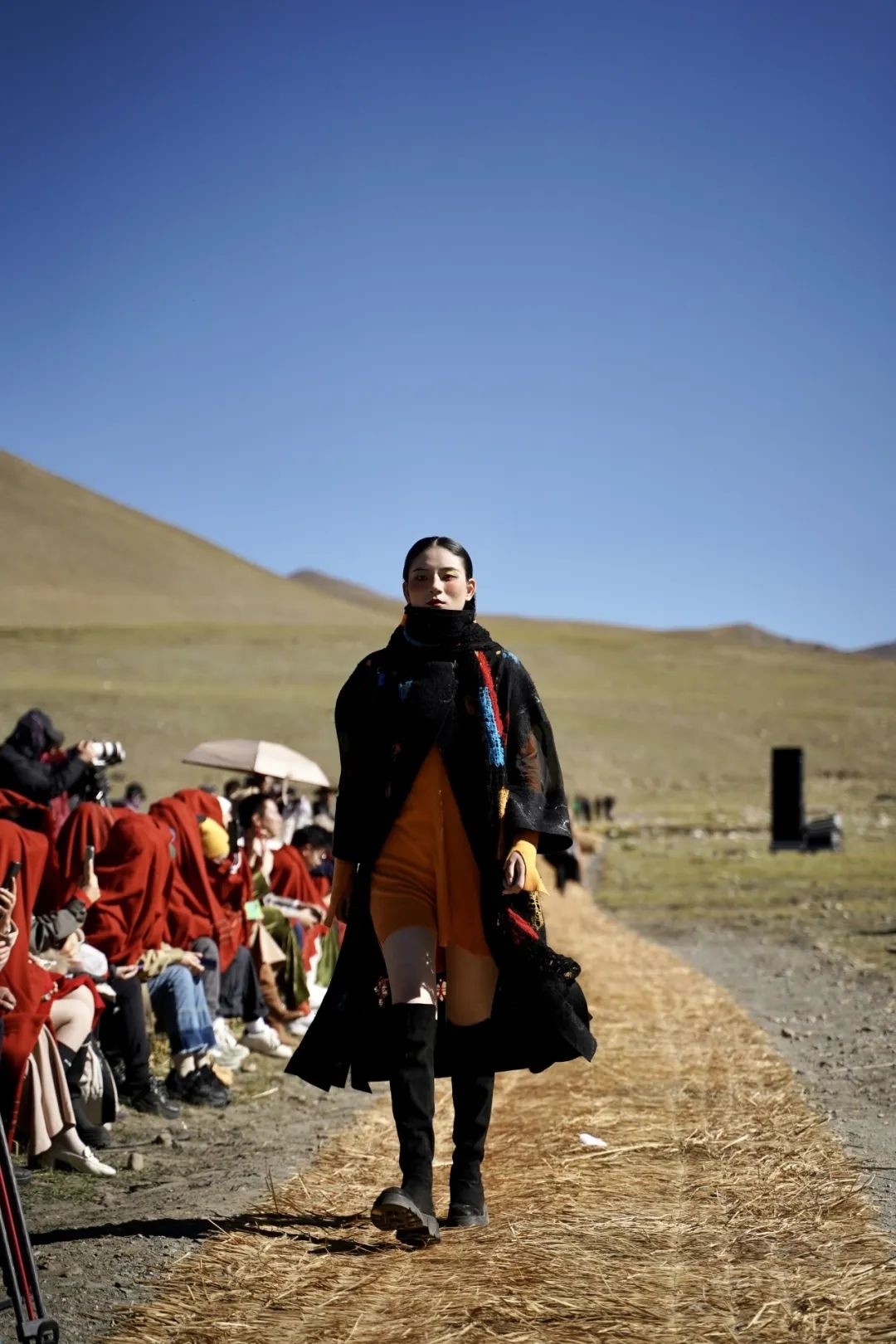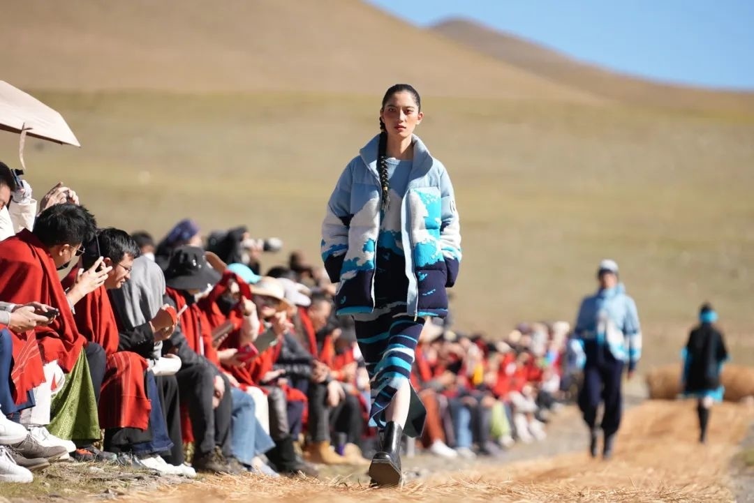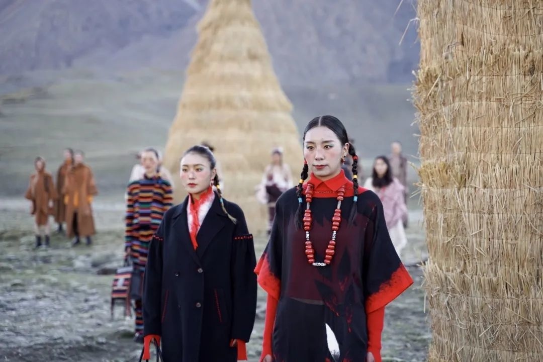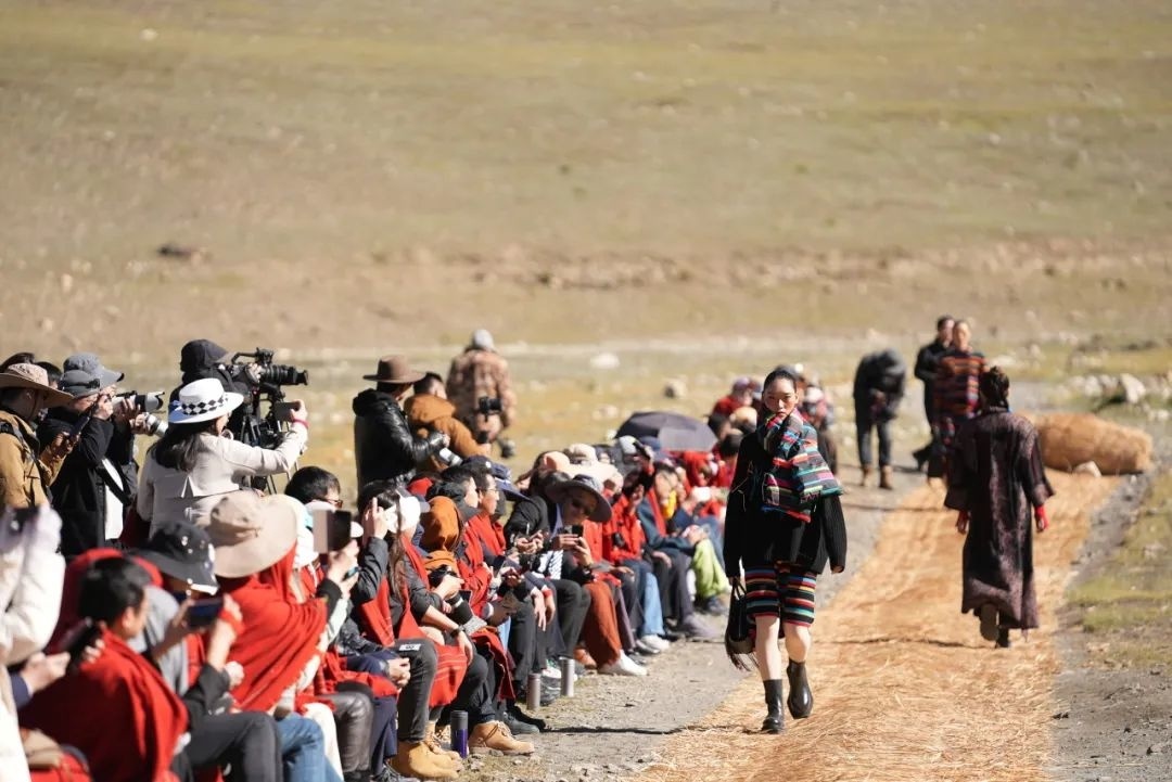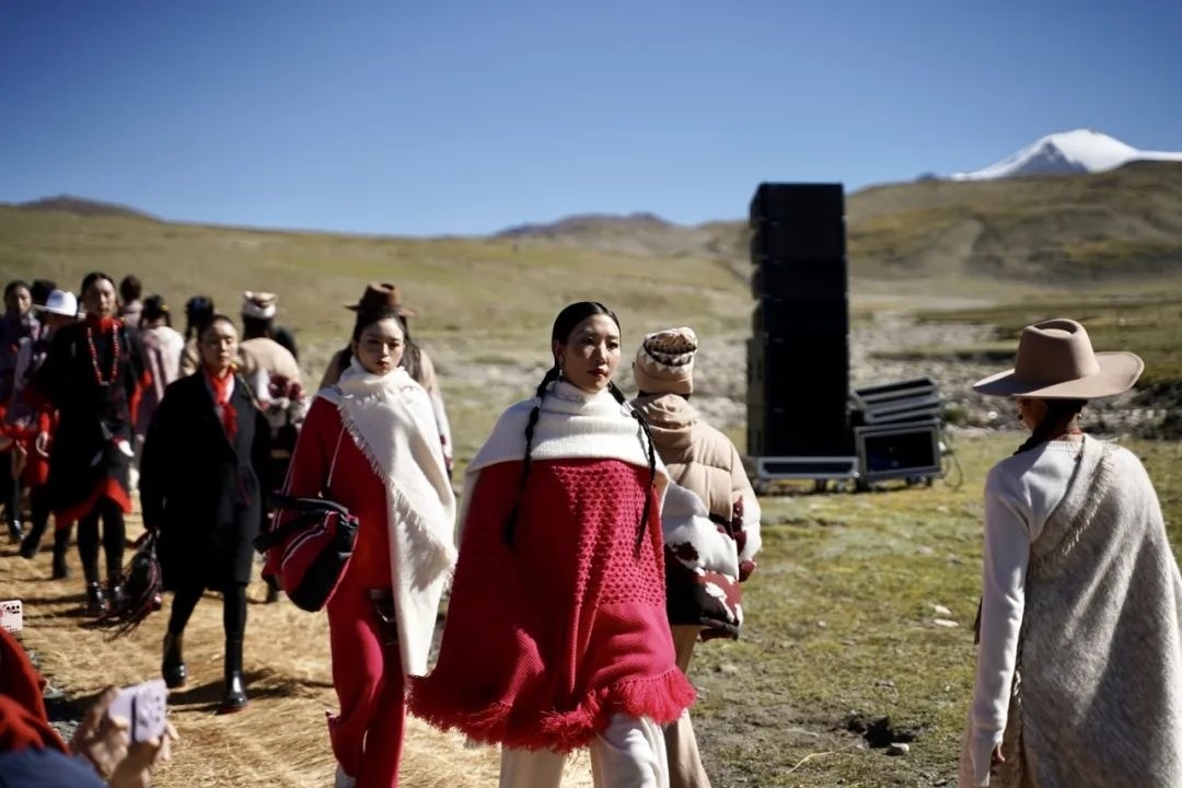 这是沙涓近三年来复兴西藏传统氆氇手工艺后的全球首发,而且选用的绝大部分“模特”是藏族姑娘小伙,其中有教师、有学生,还有合作社的手工艺匠人,旨在更原本地展现藏族风情。同时,大秀现场布景都是用刚收割的青稞秸秆搭建,结束之后全部散开作为牦牛草料,最大程度减少对雪域牧区及当地生态环境的影响。