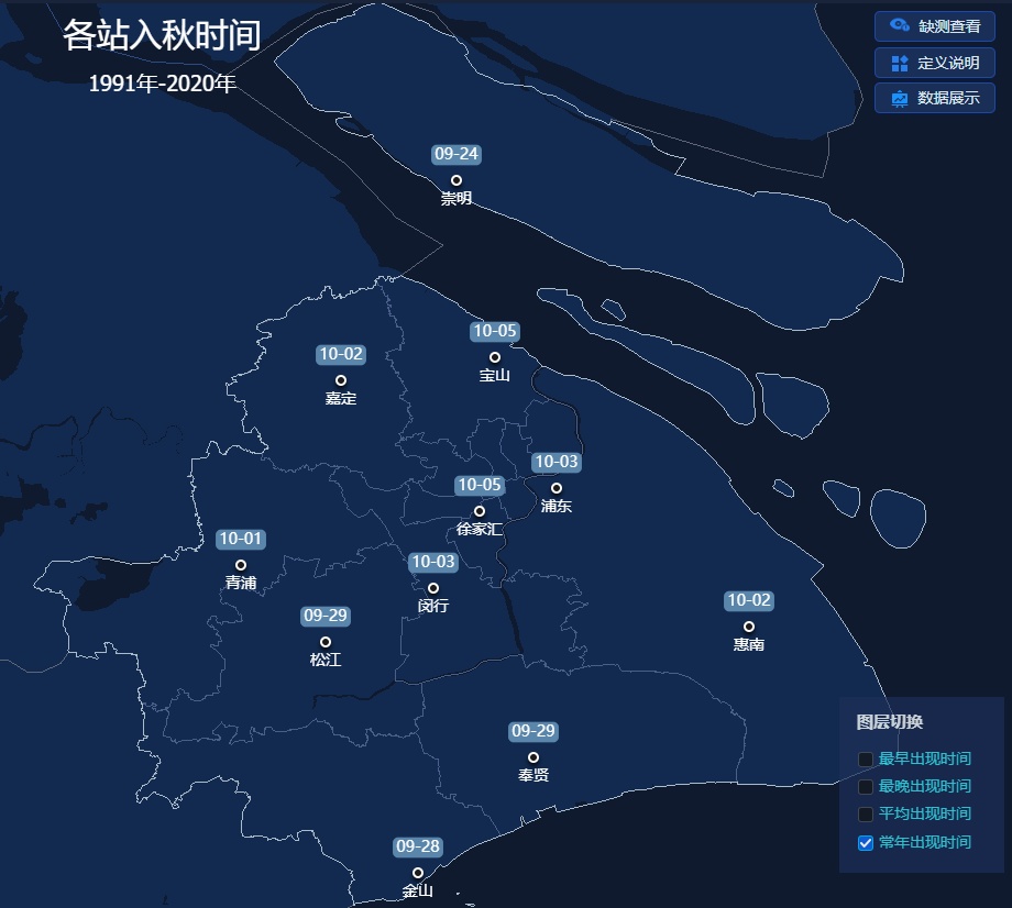 根据气候统计,徐家汇站常年入秋时间为10月5日,算算时间也相差不远了。季节交替之际,气温起伏,晴雨变换,大家要注意适时调整着装,谨防感冒。