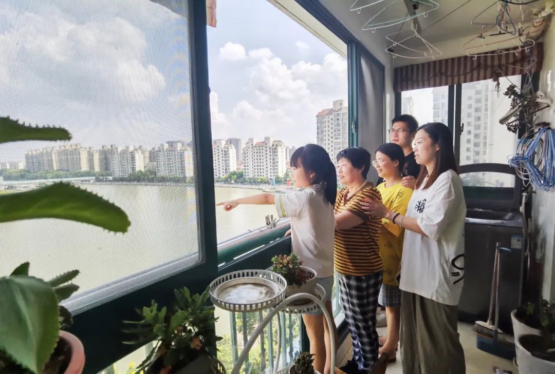 泗泾塘上鼓声阵阵,水花飞溅。除了来到现场观赛的市民可以欣赏比赛,河岸的居民楼里也热闹非凡。润江花苑居民周扣勤所在的楼栋成了最佳观景台,比赛场景一览无遗。他约了三四个朋友来家中小聚,为此还准备了一顿丰盛的午餐。居民吉庆是摄影爱好者,由于家中阳台距离比赛场地很近,从比赛筹备起,他就用镜头把所有的场景都记录了下来。比赛当天,他家的“观景台”也早早被同事们预定,带着孩子们一起欣赏家门口的龙舟赛。