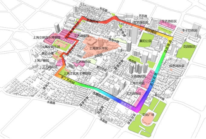 责任建筑师清华大学建筑设计研究院团队的更新方案围绕如何强调更新单元内公共空间的艺术性来开展,通过打通背街小巷,串联“触媒点”,植入文化业态,连通生态空间,系统锻造一个充满人文历史气息和艺术氛围的活力空间系统。同时,结合每个地段的业态和空间特点,进一步强调建筑的开放性、连接性和识别性,形成一系列具有“衡复”特点的微更新建筑“簇群”。