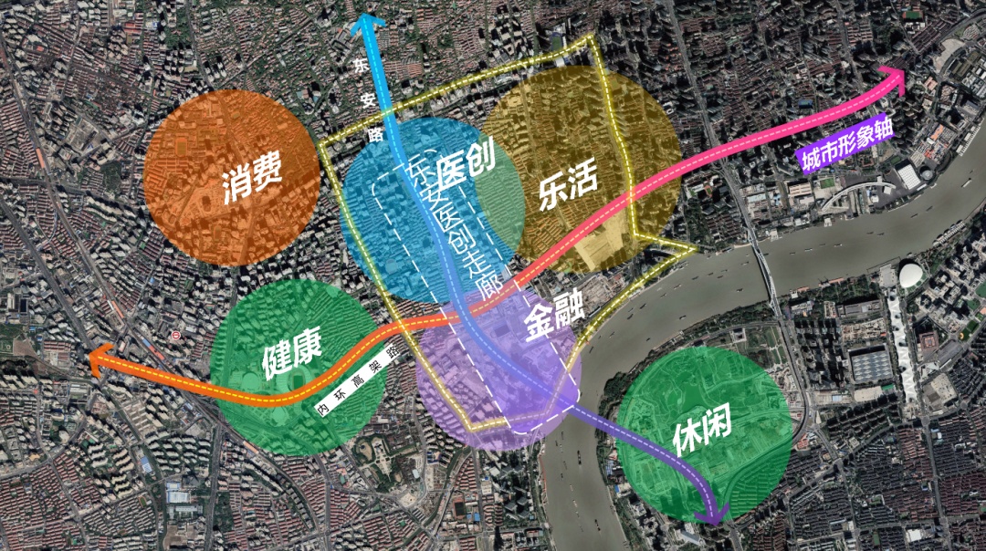 责任规划师上海市城市规划设计研究院团队强调以产业功能提升带动地区高质量发展,发挥地区医学资源和人才底蕴优势,融合科创功能,规划东安医创智慧城。通过缝合内环高架南北空间,串联徐汇滨江公共活动空间和衡复风貌区的历史资源,打造医校研创区和医创核心区,沿东安路规划国际医创走廊和国际医创门户等节点。