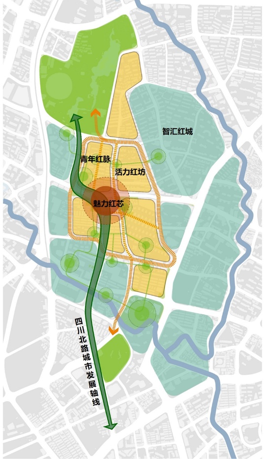 责任建筑师东南大学建筑院团队提出在保护与展现历史格局的基础上进行空间创新的设计理念,基于山阴路风貌区丰厚历史文化资源塑造“向阳花”空间结构。依托四川北路城市发展轴线,疏通“青年红脉”,串联多元主题功能的青年网络;打造“魅力红芯”,围绕宝华商业广场塑造具有门户形象及人群集散功能的片区公共中心;更新“活力红坊”,激活溧阳路48栋花园洋房、浙兴里等特色风貌街区;重塑“智汇红城”,沿风貌区外围挖掘具有开发潜力的空间,打造现代办公、居住混合街区。期待“红色山阴,向阳再生”。