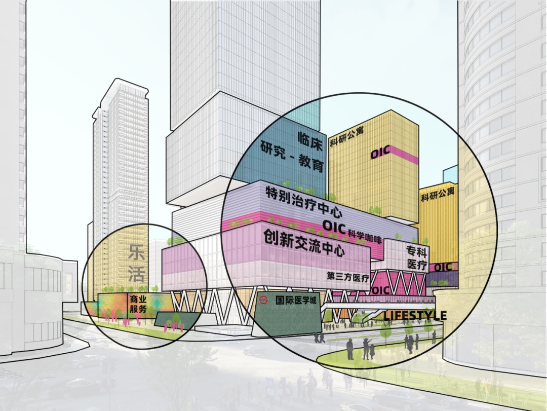 责任建筑师华建集团上海院团队的方案以医创神经中枢为设计理念,强化东安路医学产业及历史发展轴带,形成“一廊三带五组团”总体空间结构。通过“再交互、再缝合、再激活”的更新策略,加强东安片区与周边片区的功能互动,空间联系以及风貌协同,为引入国际先端医学创新产业以实现与大院大所医学研究的高效率转化提供建筑空间载体,同时通过周边公共空间、服务配套的有机更新,共同打造东安国际医创城。