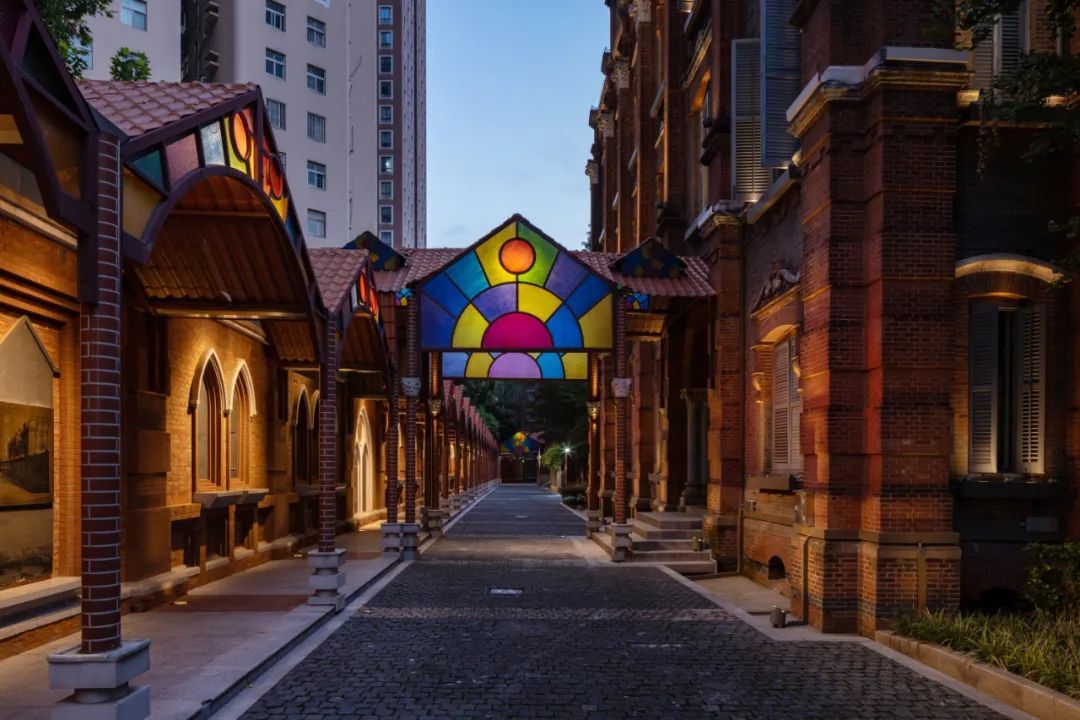 走近校区连廊处,彩色的花窗光影琉璃,散发出这座百年老校光辉的历史。夜幕降临,以“灯”传情,让走廊墙上的展品与浮雕展现出比白天更耀眼的光辉与背后的历史价值,依靠改造新赋予鲜明的活力。置身校内,通过光影重塑,门内与门外,连接着过去与现在,打造历史与现代的时空交互,体现徐汇的海派风貌,融合之光。