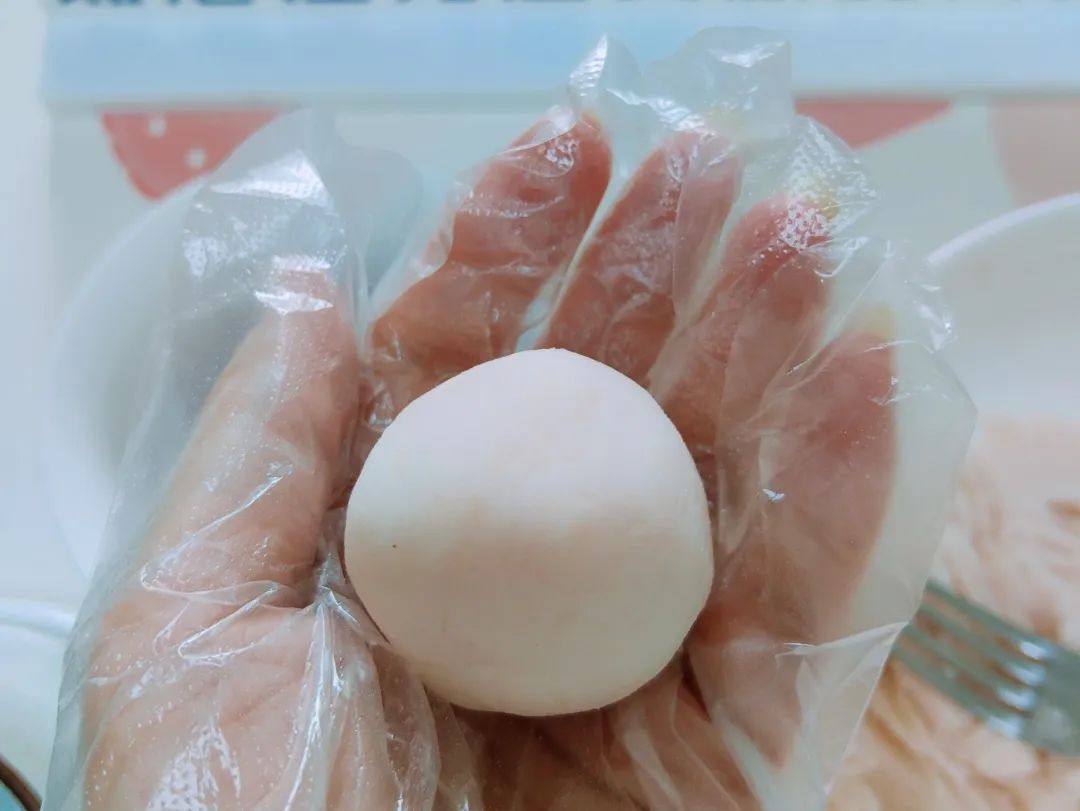 将糯米粉和山药泥混合拌匀,并进行揉搓,直至面团颜色呈现漂亮的淡粉色即可。
