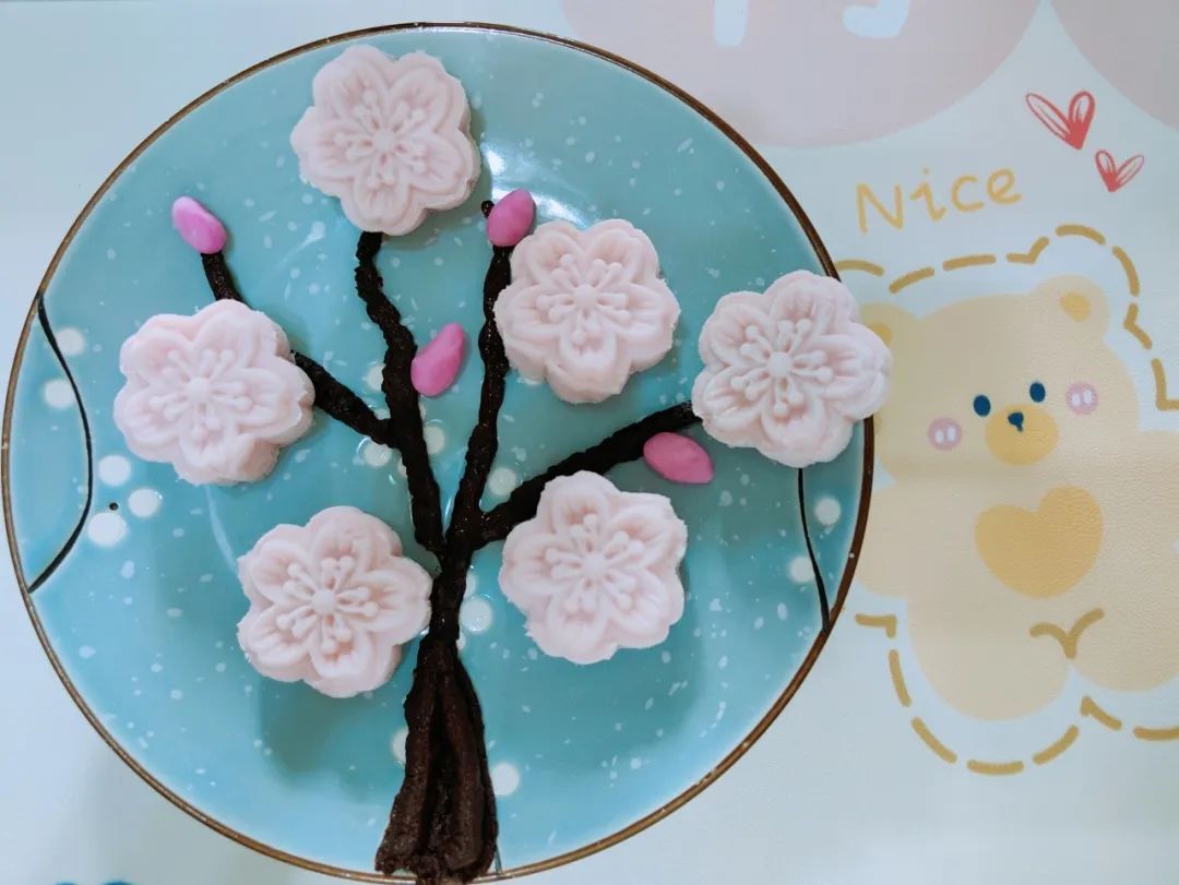 将糕点从磨具中脱出,一朵朵樱花绽放在餐盘中。