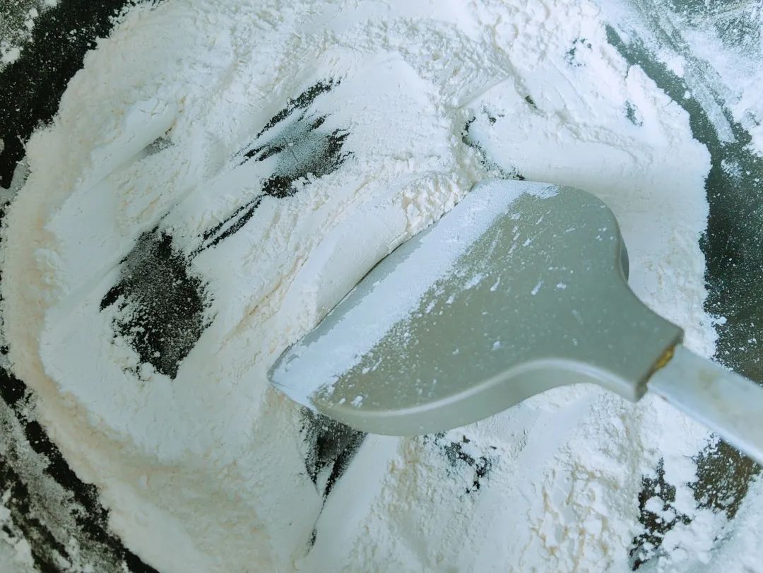蒸山药的时候,把糯米粉放入不粘锅,小火炒制到微微发黄。