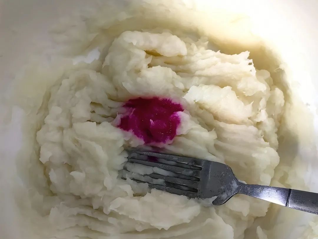 趁热将山药压成泥,加入细砂糖和炼乳,少许火龙果汁,不要加太多,一点点添加。