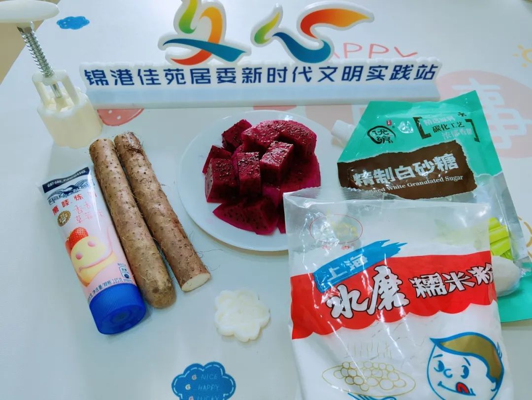铁棍山药330克、糯米粉65克、白砂糖10克、草莓炼乳10克、火龙果、巧克力、牛奶。