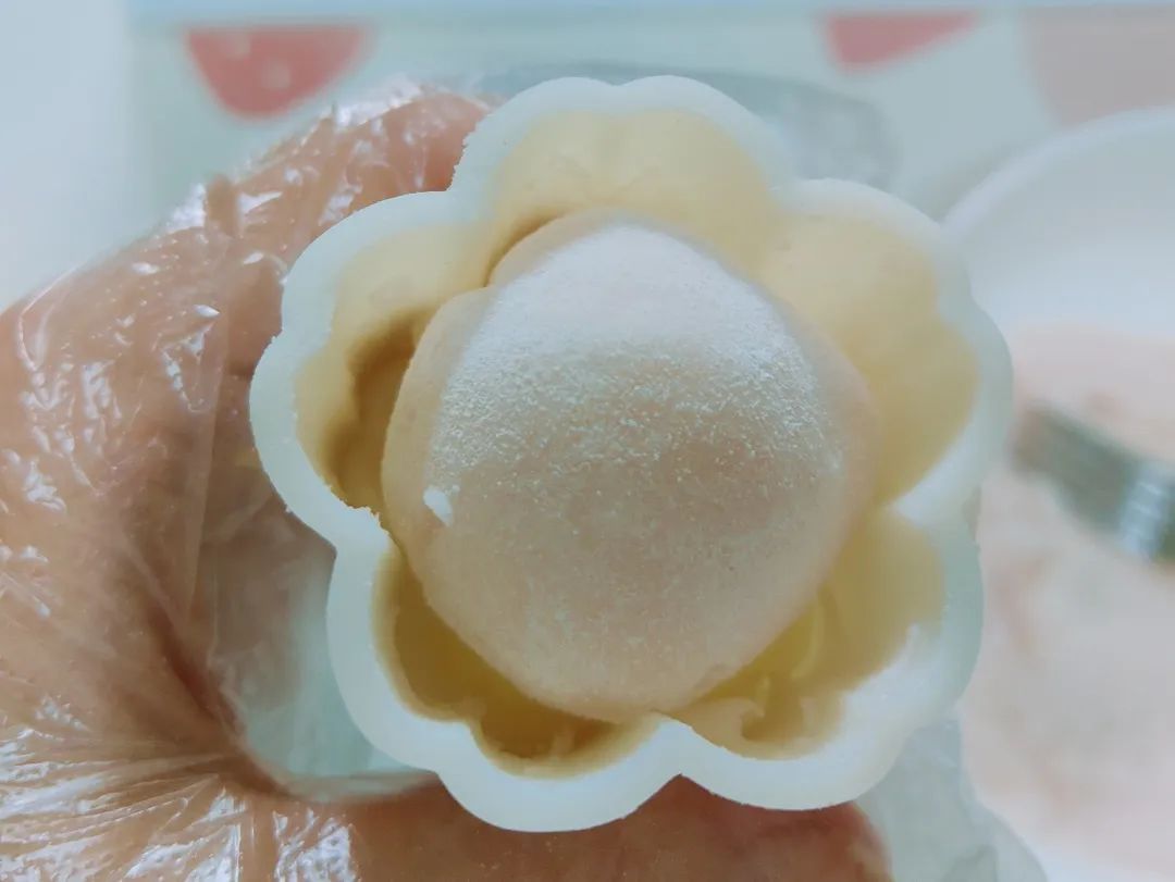 取30克山药泥揉成团,放入模具压出花朵形状。