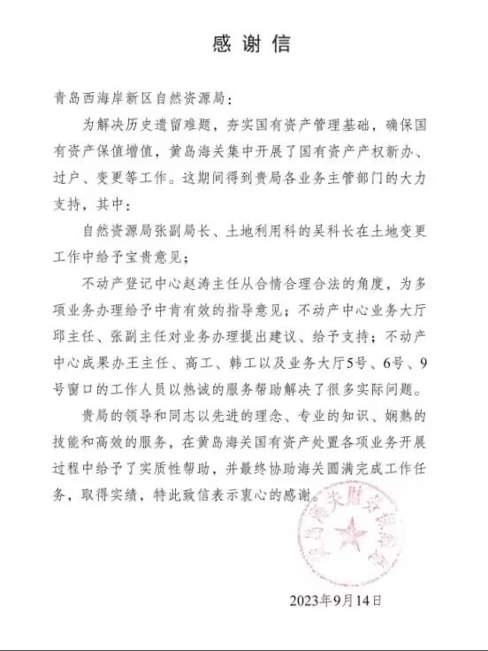 近日,黄岛海关将一封情意满满的感谢信赠送到青岛西海岸新区自然资源局,感谢该局在办理因历史遗留的不动产登记过程中给予的政策支持和实际性帮助,确保了国有资产安全和保值增值。