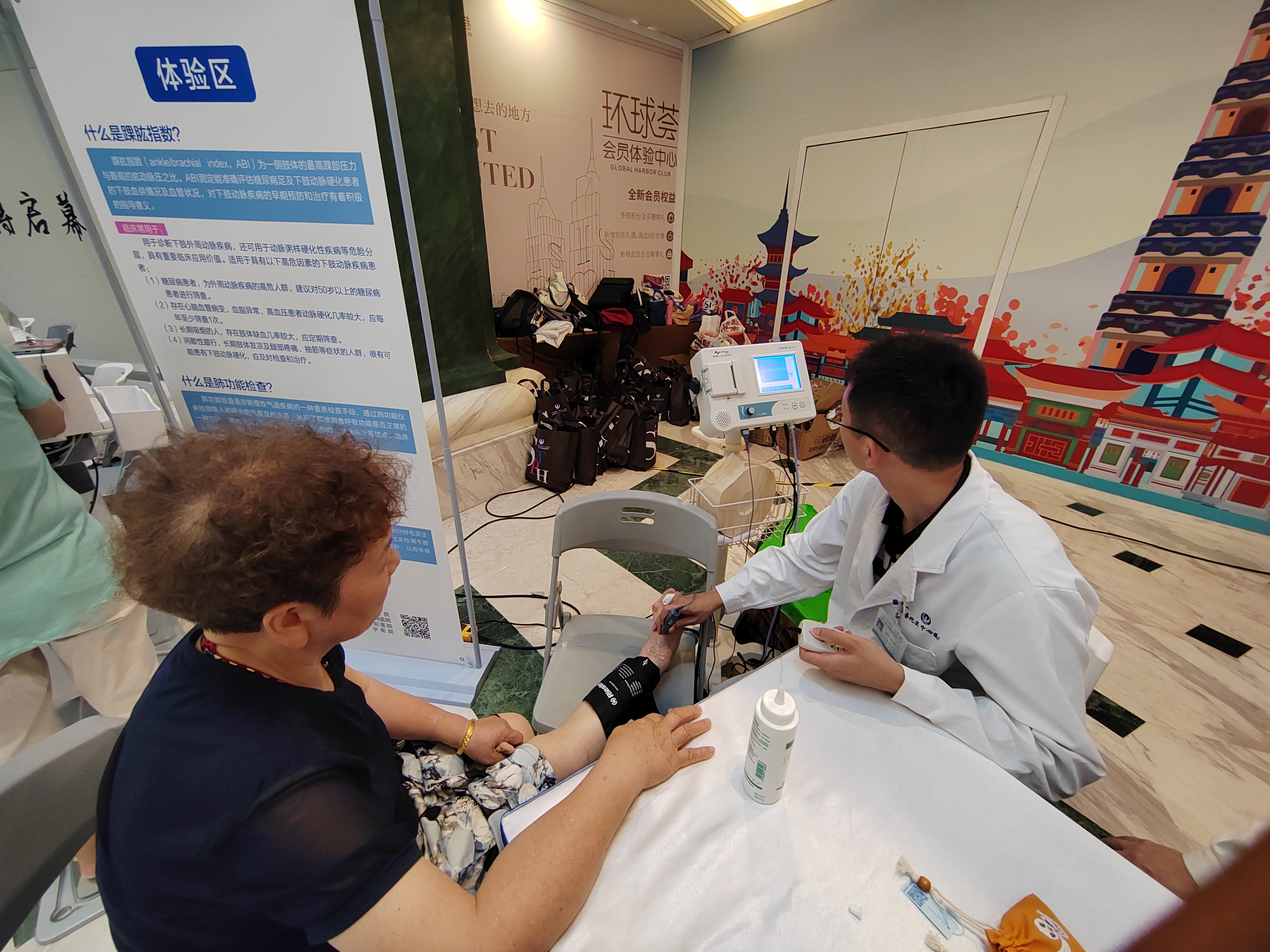 在ABI踝肱指数测定仪器前,市民徐阿姨体验了踝肱指数测定。“我有静脉曲张,血脂有点高,正好检测一下看看下肢血管情况。”徐阿姨看着仪器数据不断变化,听着医生介绍。“我们这台机器主要是测量下肢的动脉血压和踝关节的动脉压力的比值,筛查下肢动脉硬化的风险。”检测医生告诉徐阿姨,她检测的血管良好。