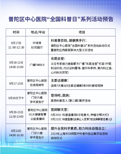 现场,普陀区中心医院“全国科普日”系列活动正式启动,并发布活动预告片。此次健康科普系列活动是以医院“心心相印·普中情”党建品牌为引领,进一步深化“五有五心”系列活动内涵的创新之举,活动将从9月17日持续至9月23日。期间将举行一场大型义诊活动、一次科普比赛、一次学术会议,开展两次健康科普直播,推送五位专家做客都市广播FM89.9“名医坐堂”栏目,邀请院内七位担任全国或上海学会的主任委员拍摄制作《主委话健康》系列科普短视频,为社会大众提升健康素养,筑牢健康“防线”。