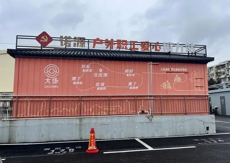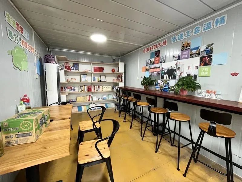 驿站处于园区核心位置,由两个集装箱改造而成,通了水电,装了空调,每天从早晨6点到晚上10点开放。前期调研时,大场镇便召集镇总工会、产权方大场商业公司、诺源园区和快递物流公司共同参与驿站建设方案讨论,收集骑手诉求,才有了如今的两个温馨小空间。其中一间为“歇脚地”,内部放置洗手台、饮水机、微波炉、冰箱、电视机等设施,旨在缓解小哥“吃饭难、喝水难、充电难、休息难”的现实问题。另一间为“加油站”,设置了一排书架和高脚桌椅,感兴趣的小哥可以忙里偷闲“充充电”,小组活动也可以在那里办。