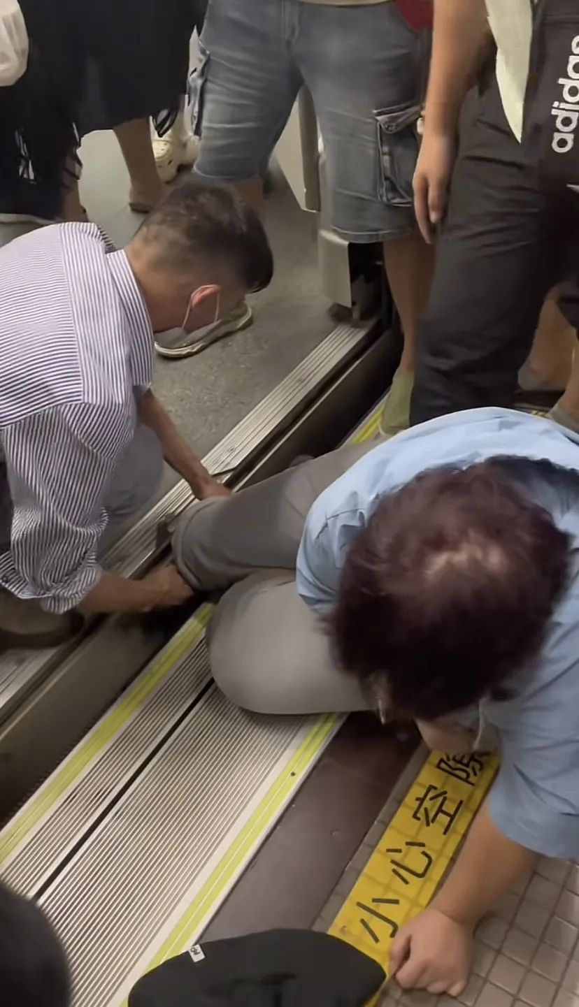 在接到乘客腿部被卡的消息后,车站工作人员迅速拿来扩张器,找到着力点后,工作人员将扩张器顶在列车车厢和站台空隙处,将空隙撑大,最终帮助当事女乘客脱困。经现场检查,女乘客小腿无大碍,随后自行离开车站。