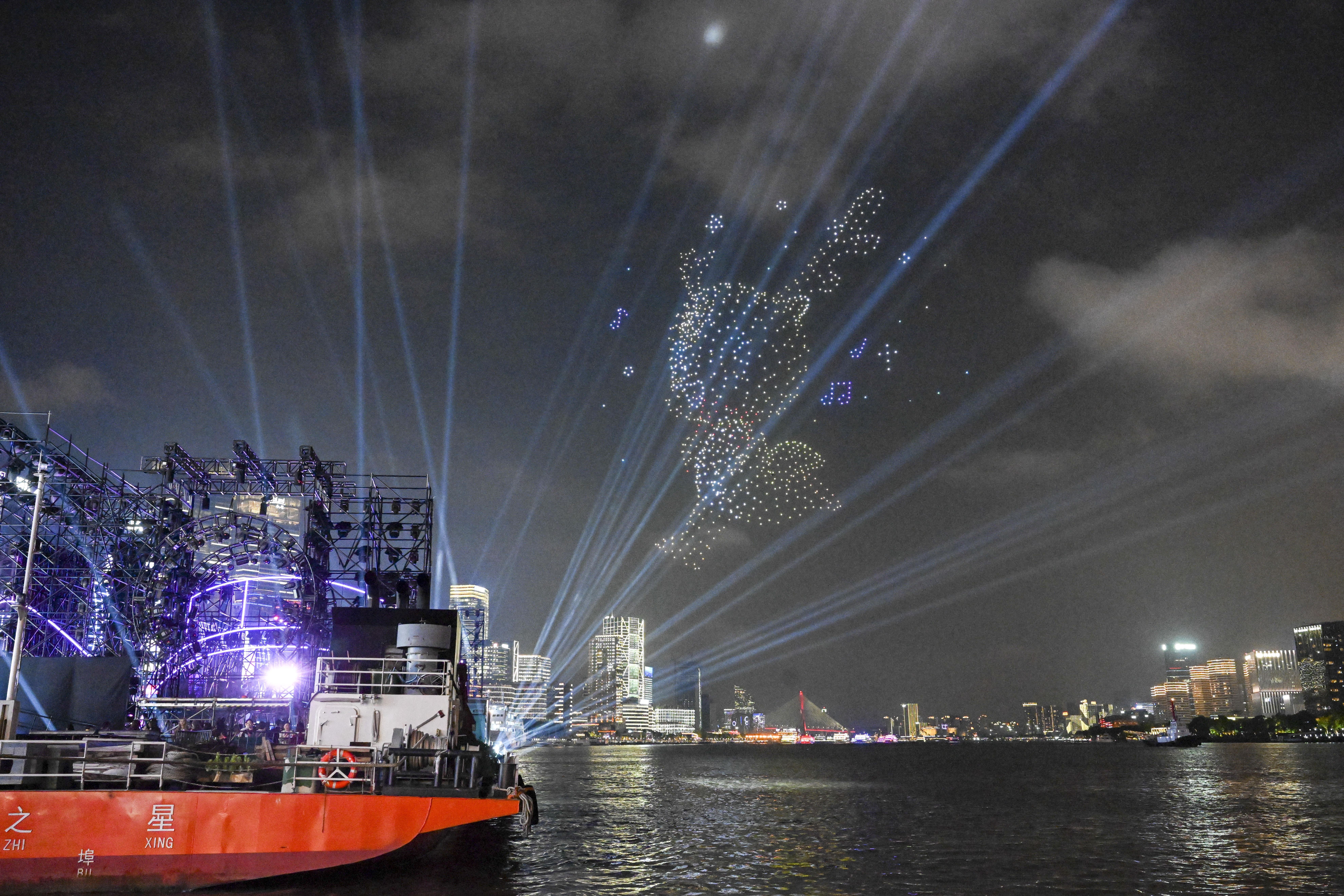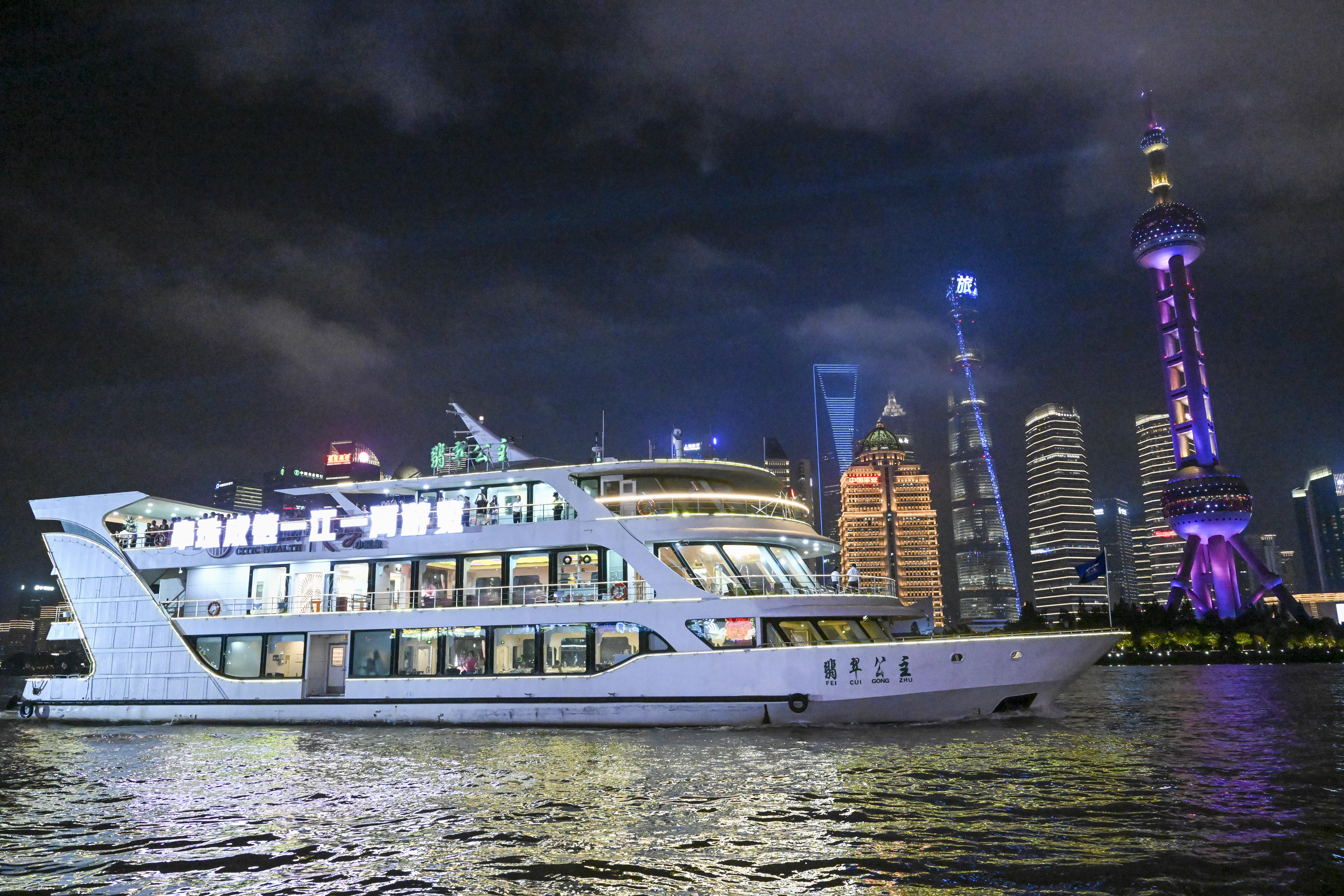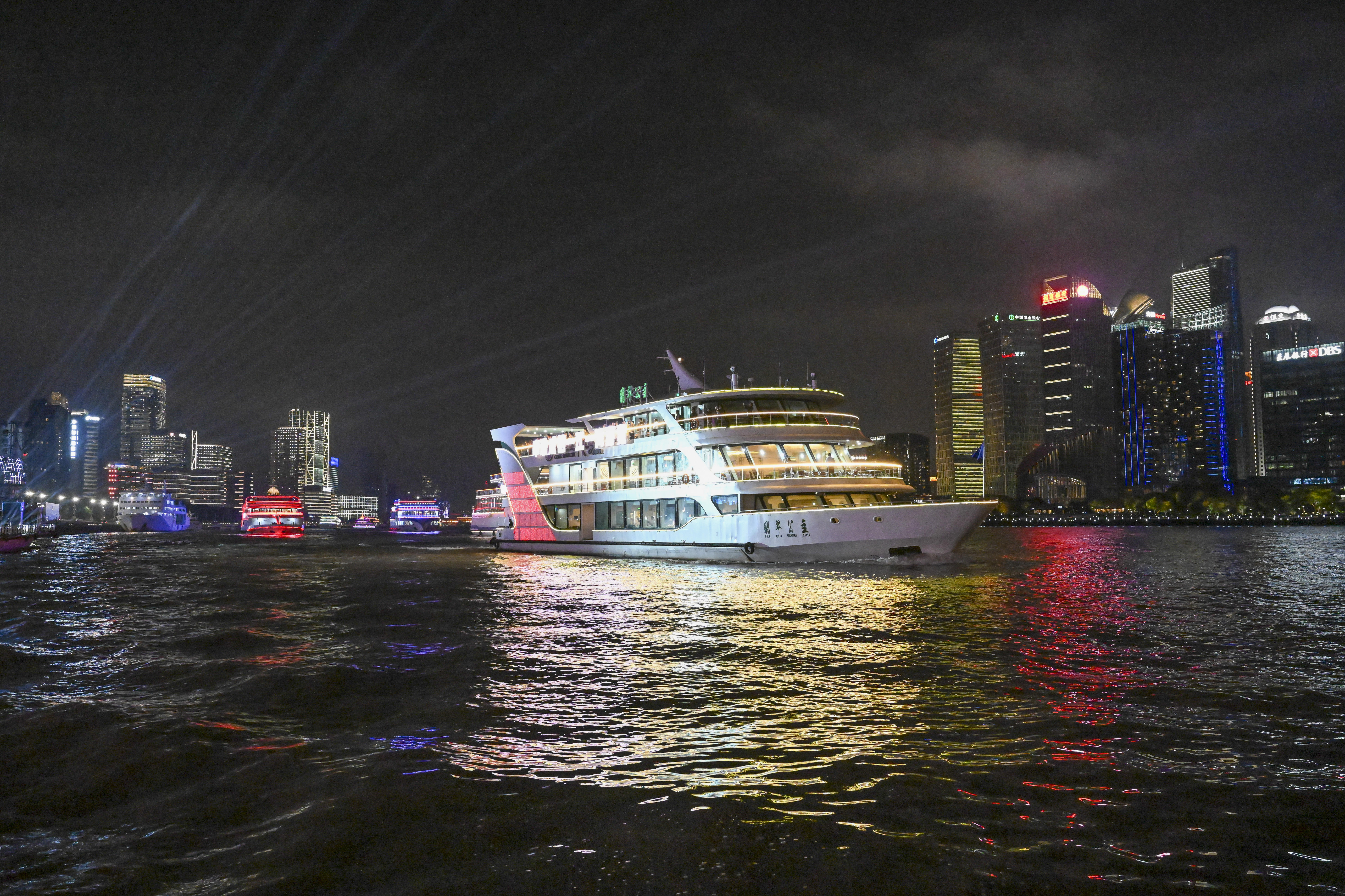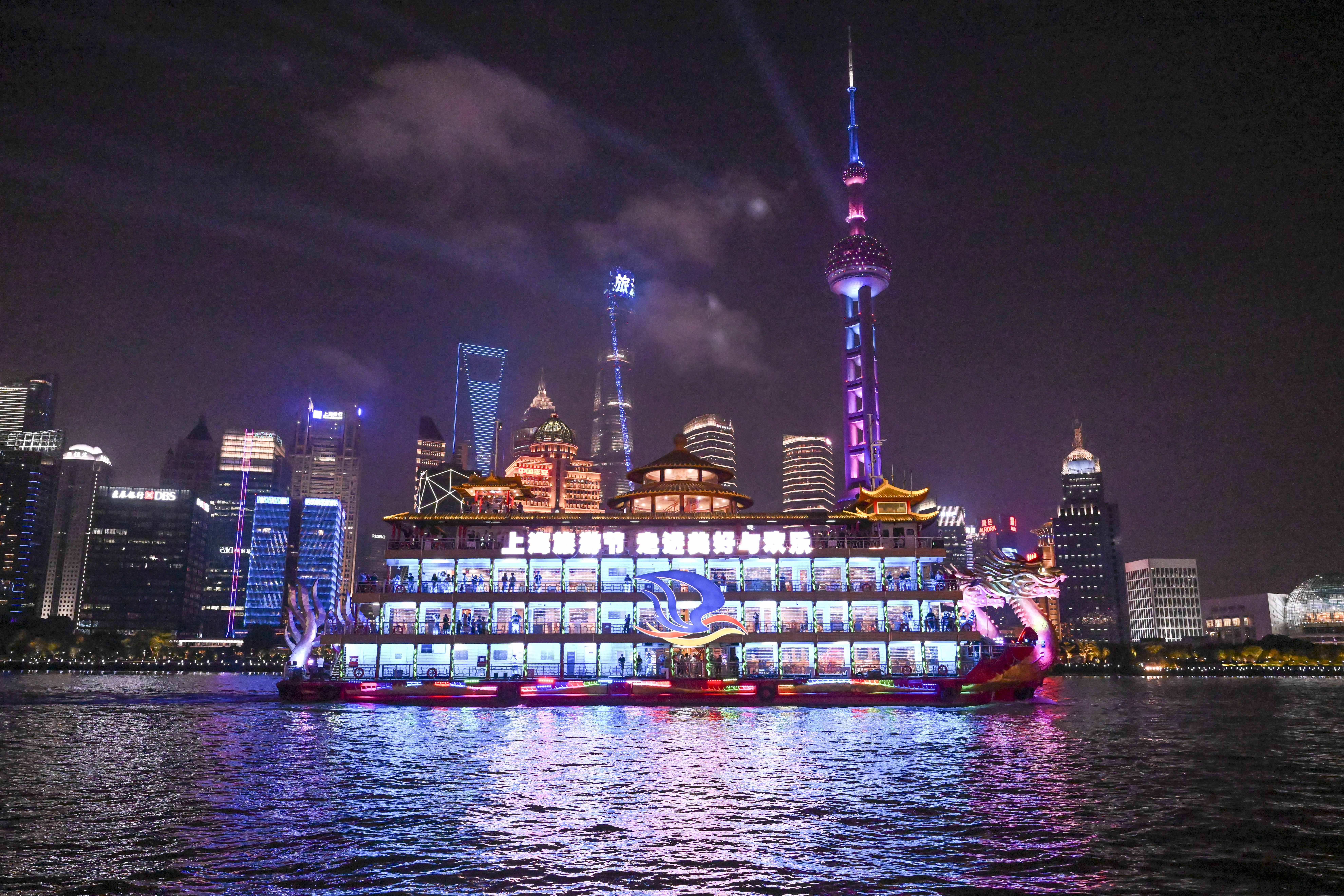 参加巡游的游览船进行了灯光亮化和装饰升级。19艘游览船被分为前后2个编队,在4艘巡逻艇的护航下,呈双排交错队形依次经过北外滩国客中心开幕式前沿水域。国客中心主会场对巡游彩船作主题演绎并配合进行节目演出,以精彩的水上巡游联动岸上光影特效和文旅活动,全方位点亮大巡游之夜,直播展示黄浦江两岸物阜民丰、流光溢彩的城市魅力。本次参加巡游的游览船按照乘客定额的70%载客,彩船巡游活动并未影响游览船的正常营运。为保障跟船巡游的乘客安全,确保活动顺利进行,黄浦海事局强化水上监管服务力度,多措并举为巡游活动保驾护航。