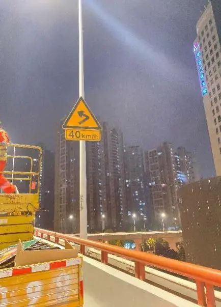 此外,本次专项工程成功解决了原有标志标牌色泽暗淡陈旧,反光效果明显衰减等问题,以及因紧固件松动、锈蚀等可能带来的高空坠物隐患,并在设施转弯半径较小的地方增设了警示标志及转弯诱导牌,以提醒社会车辆减速行驶,进一步提升了交通安全性。