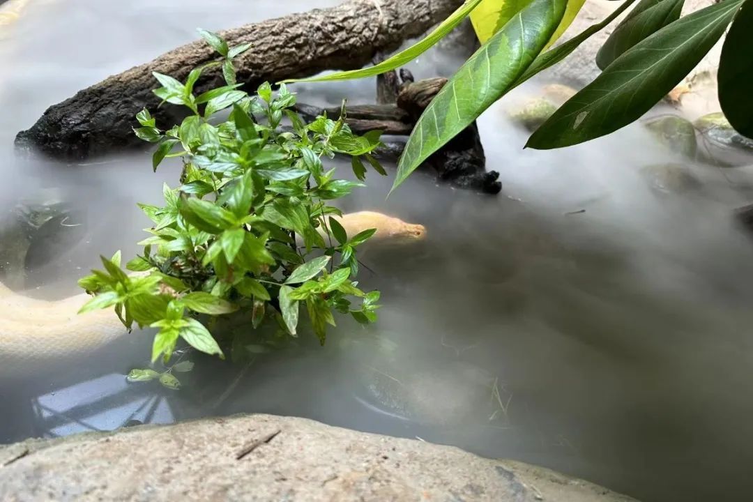 这一次还在水池里增加了雾化器,可以增加环境湿度的同时,也大大提升了观赏效果,并且水池中还迎来了新住客——中华草龟和中华花龟,并且也增加了本土鱼类的数量。经过简单的组合搭配,尽可能还原一个热带雨林的环境。让蟒蛇住着舒服,住着安心。