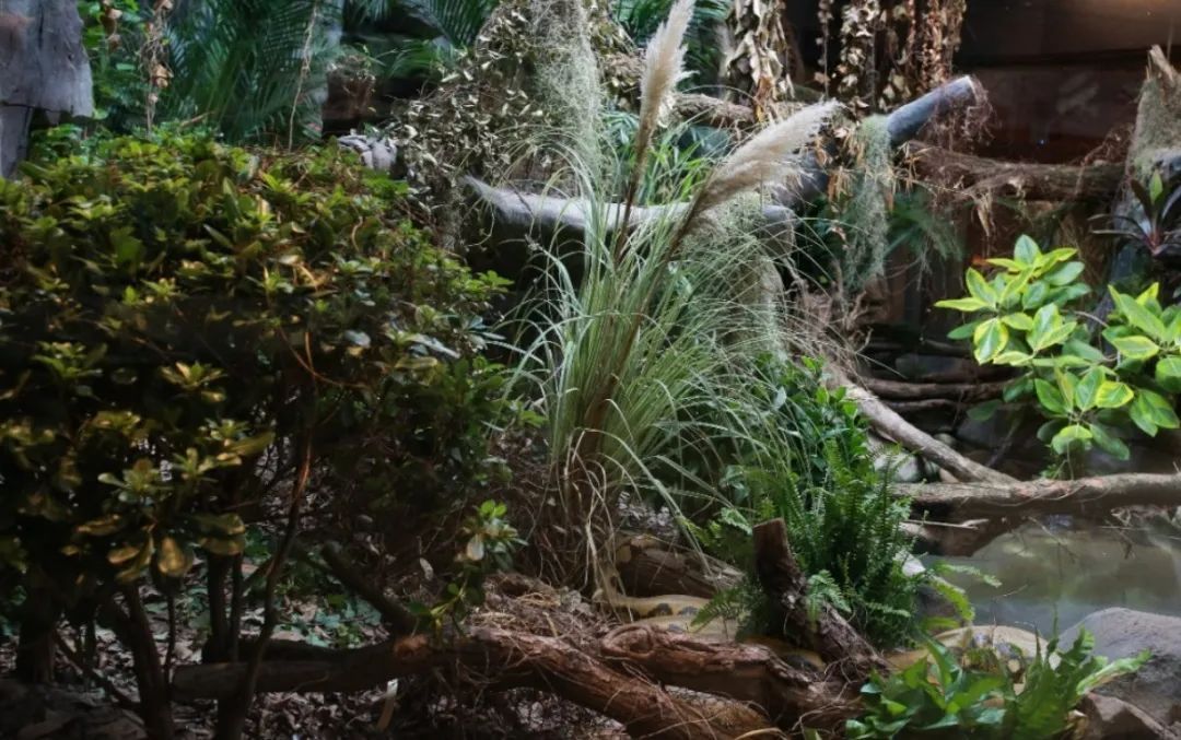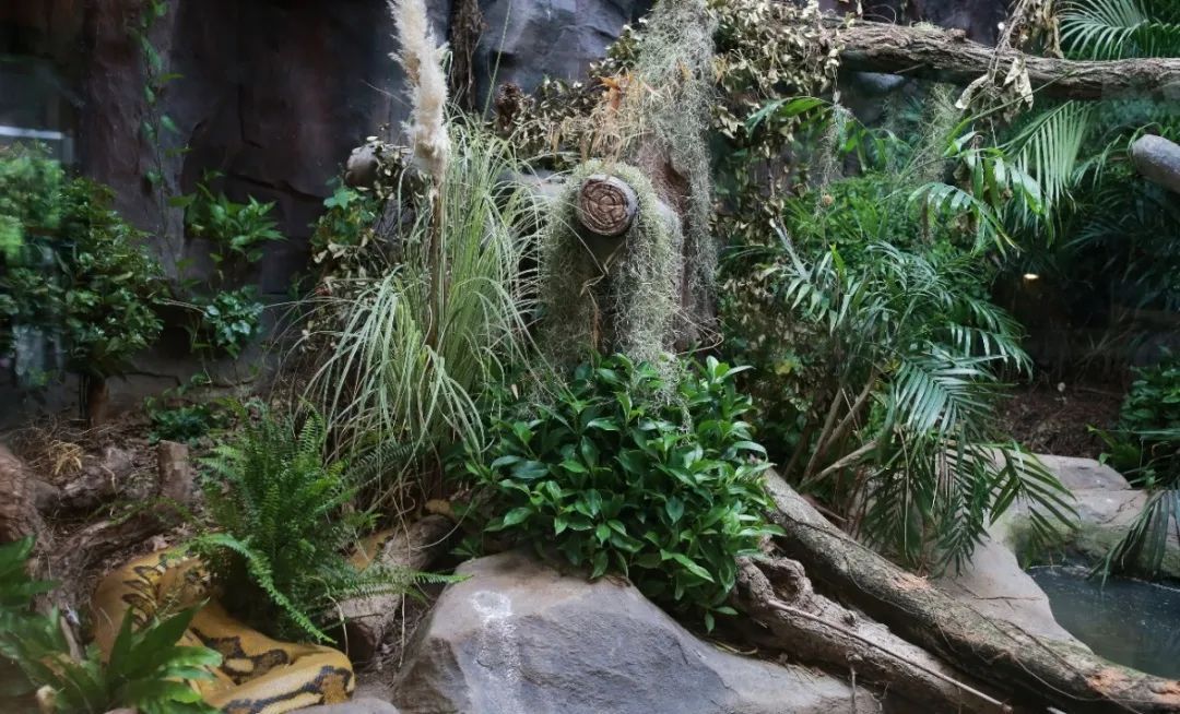 首先在居住环境方面,尽可能模拟蟒蛇在野外的生存环境,在展区内种植了亚热带植物,棕竹、海桐、朱蕉、非洲茉莉、海芋、肾蕨、鸟巢蕨、广东万年青、凤梨,空气凤梨,绿萝等,再配上一些本土植物和藤类,例如:麦冬、芒草、锦屏藤、常春藤。展区里大大小小的植物可以构成蟒蛇的栖息点和躲避点。