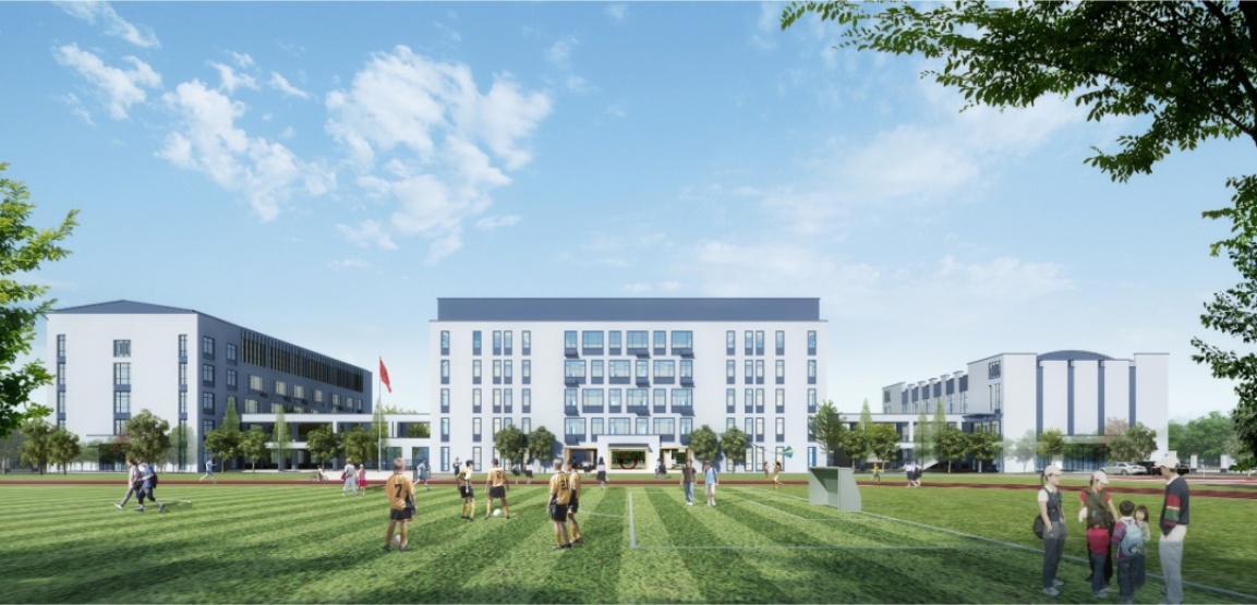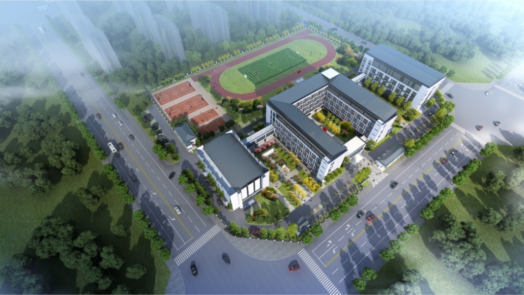 项目按照24班规模建设,由1栋5层普通教学楼,1栋5层专业教学楼,1栋2层食堂,风雨操场,2栋2层连廊,1间门卫、变配电室,1间门卫、水泵房,1间垃圾房组成。项目共设2个出入口,主出入口设于东侧通济路,次出入口设于南侧拱乐路。