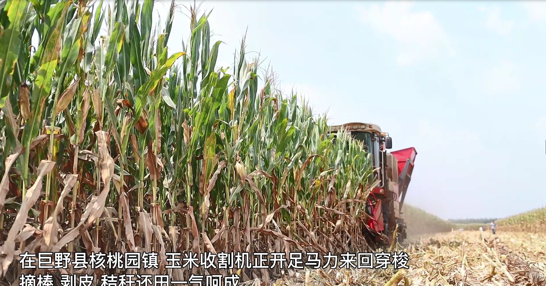 走进巨野县核桃园镇的一处玉米种植地,大型玉米收割机正开足马力,来回穿梭,一排排挺立着的玉米植株连秆带穗被卷入机械中,摘棒、剥皮、秸秆还田一气呵成。