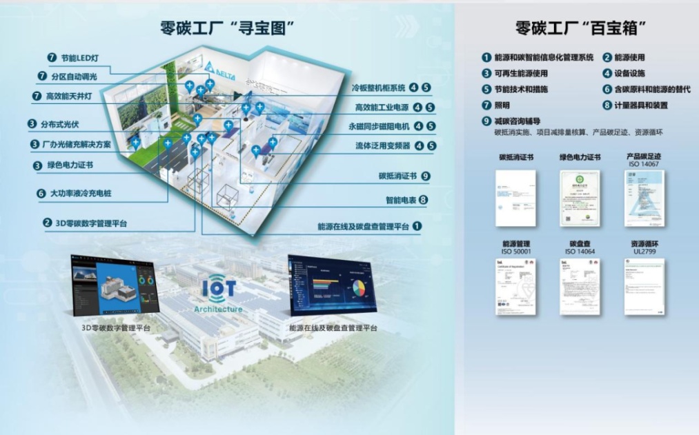 近期,位于江苏省的台达吴江五厂获评“中国节能协会标准五星级零碳工厂”,12项认证项目获得满分,取得零碳工厂与碳中和达成双认证。本届工博会上,台达把这座明星工厂“搬”进了展位,为观众现场揭秘零碳工厂“寻宝图”和“百宝箱”。