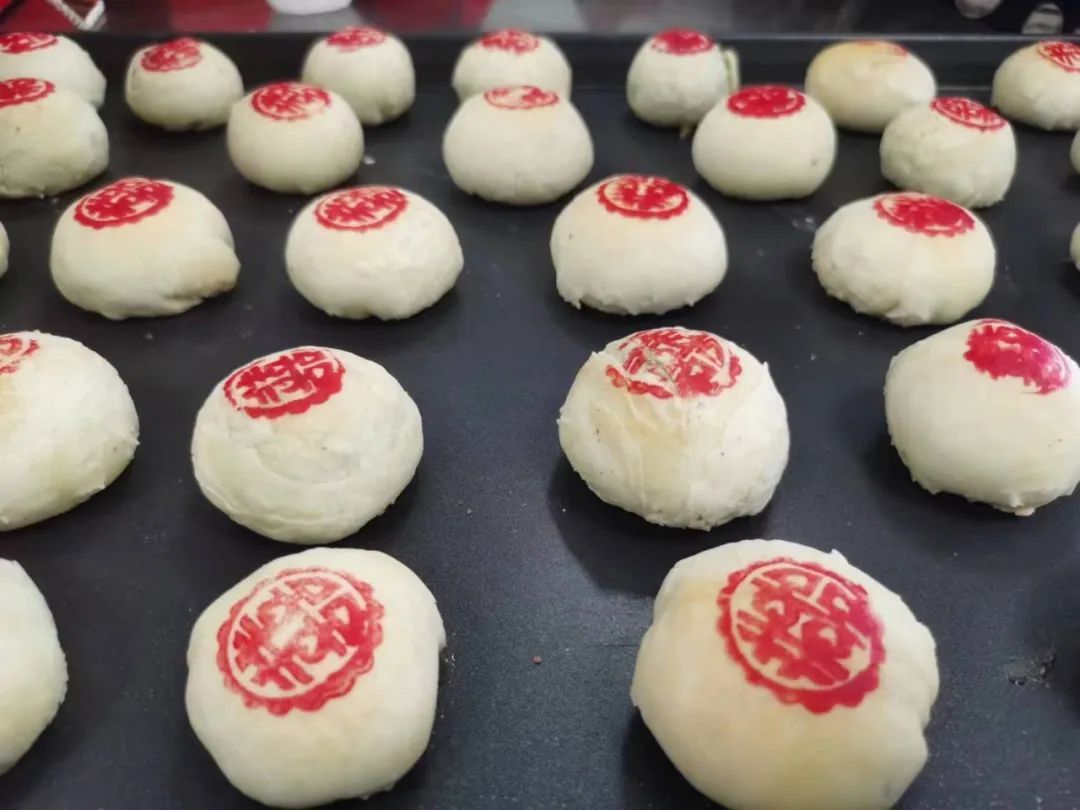揉面、擀皮、拧剂子、包馅料、塑形……经过不断摸索,学员们在赵杨的协助下,很快便掌握了制作要领。不一会儿,“白白胖胖”又象征着团团圆圆的月饼就做好了。大家小心翼翼地在洁白的月饼皮表面盖上喜庆的中式印章,这道中国传统风味美食便呈现在眼前。